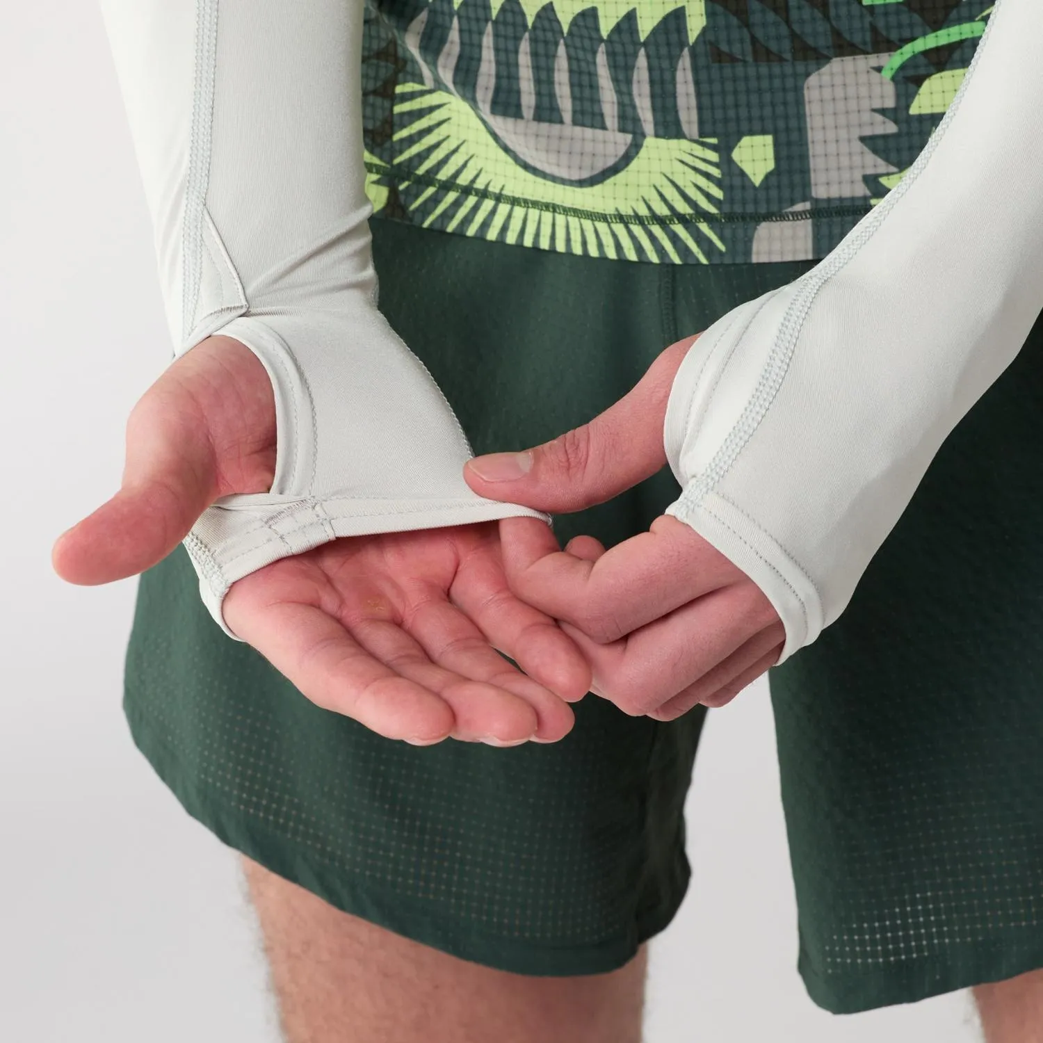 Отверстия для большого пальца на манжетах и силиконовые накладки на верхних руках удерживают рукава на месте