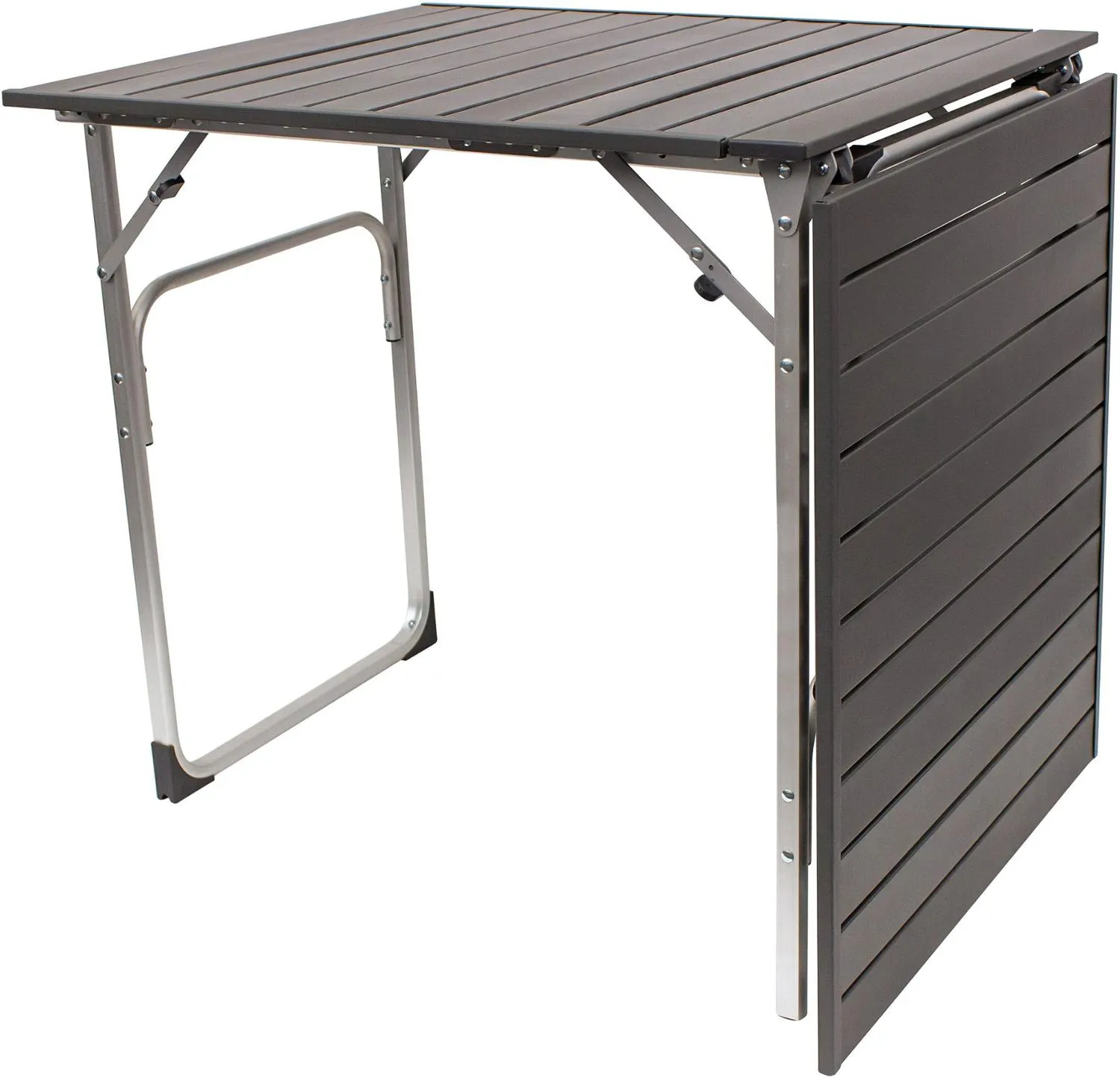 Легкий, но прочный, жароустойчивый алюминиевый столешница выдерживает до 125 фунтов. Когда приходит время собираться, стол быстро складывается и легко транспортируется с помощью прилагаемых ручек для переноски. Ноги складываются в столешницу. Размер обычный вмещает 4-5 человек; размер XL вмещает 4-6 человек. Высота стола обычного размера составляет 26,8 дюйма; высота стола размера XL составляет 29,5 дюйма.
