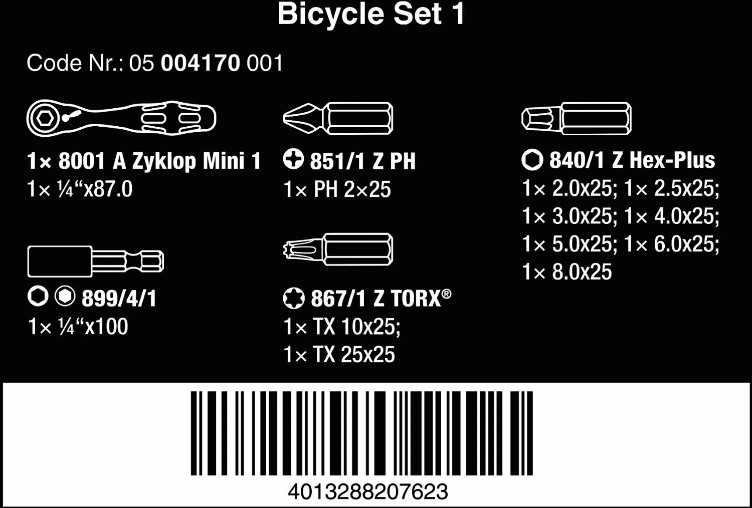 Включает трещоточный ключ Zyklop Mini 1 с приводом 1/4 дюйма (87 мм) и один универсальный держатель (1/4 дюйма x 100 мм) для увеличения досягаемости
