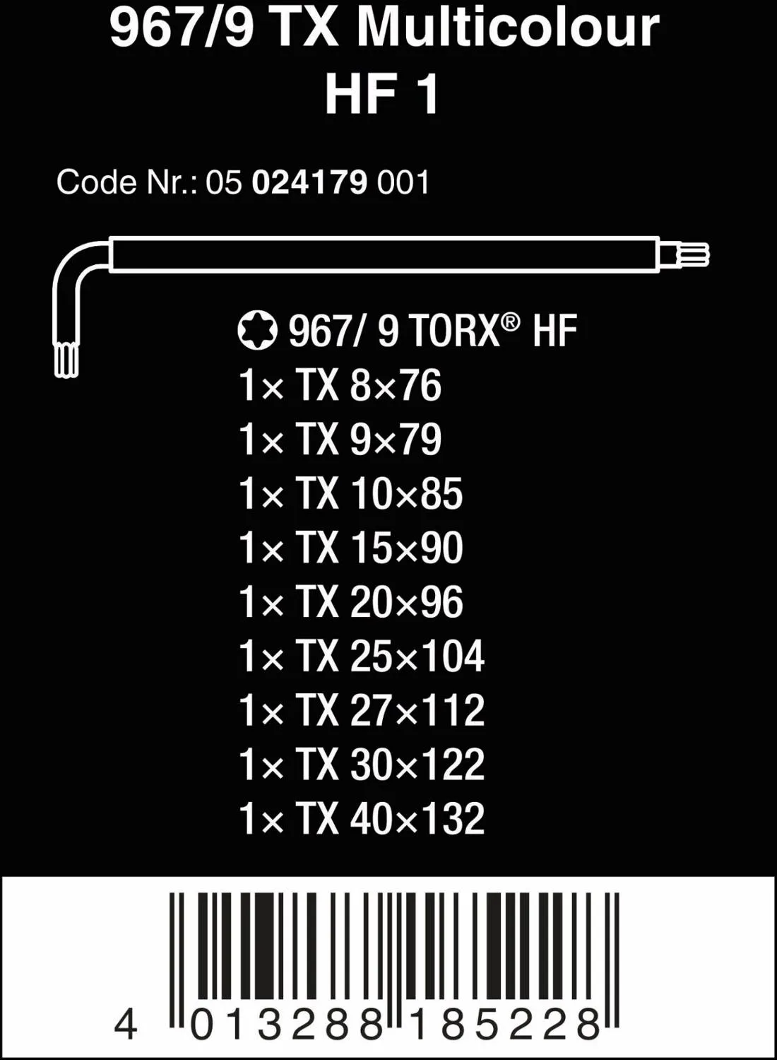 Включает девять L-ключей Torx HF 967 SL: 8 x 76 мм, 9 x 79 мм, 10 x 85 мм, 15 x 90 мм, 20 x 96 мм, 25 x 104 мм, 27 x 112 мм, 30 x 122 мм и 40 x 132 мм.