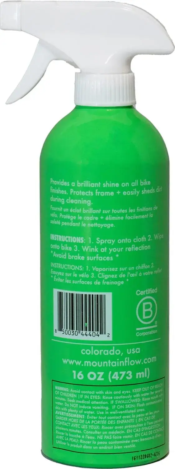 Польское и защитите свой велосипед с помощью высокоэффективной водной формулы этого экокрема для велосипедов mountainFLOW. Просто распылите его на ткань, протрите раму и наблюдайте, как она блестит.