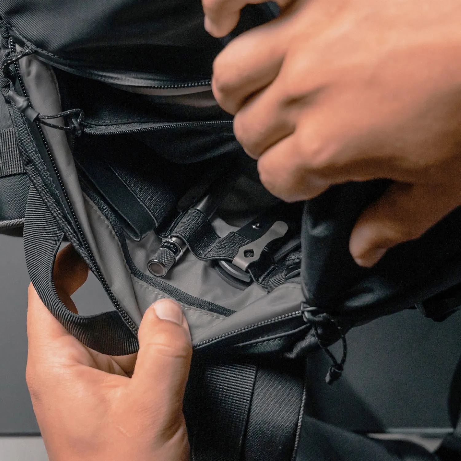 Внешний доступ на молнии ко всем карманам; запечатаемые молнии YKK и петли для безопасности молний на всех внешних карманах