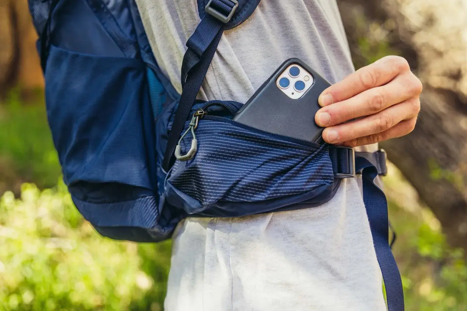 Большие карманы на поясе с молнией достаточно велики, чтобы вместить ваш телефон и другие необходимые предметы для похода