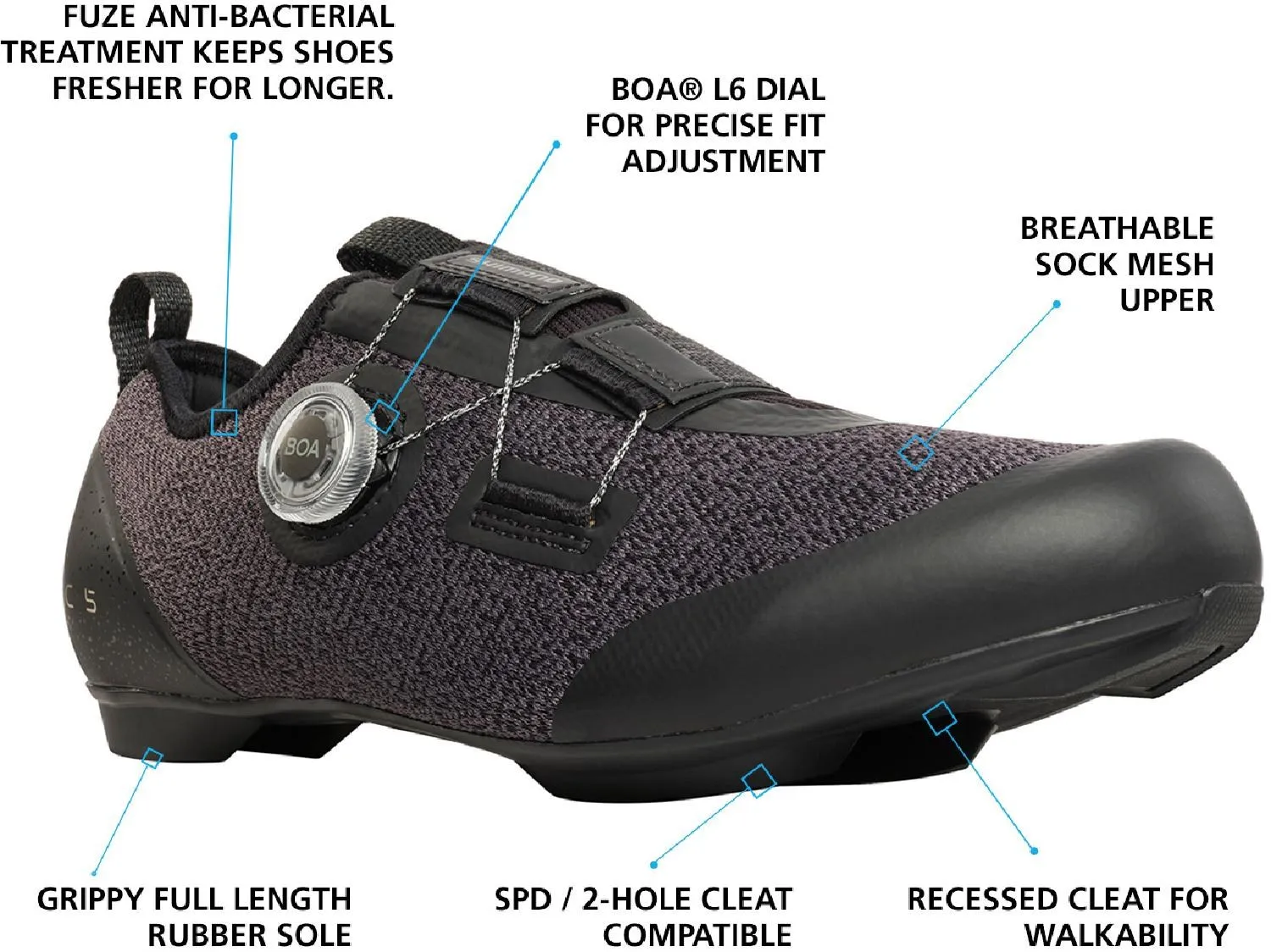 Специально разработанные для высокоинтенсивных тренировок, когда вы выбираете занятия на велотренажере, велосипедные туфли Shimano IC501 имеют легкий и дышащий дизайн, который идеально подходит для вашего времени на тренажере.
