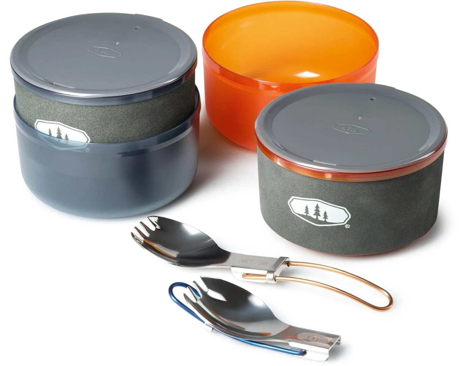 В комплект входят 2 изолированные кружки, 2 миски, пара складных ложек-вилок, крышка-страница, мешок для раковины и кастрюля из твёрдого анодированного алюминия объёмом 1,4 литра