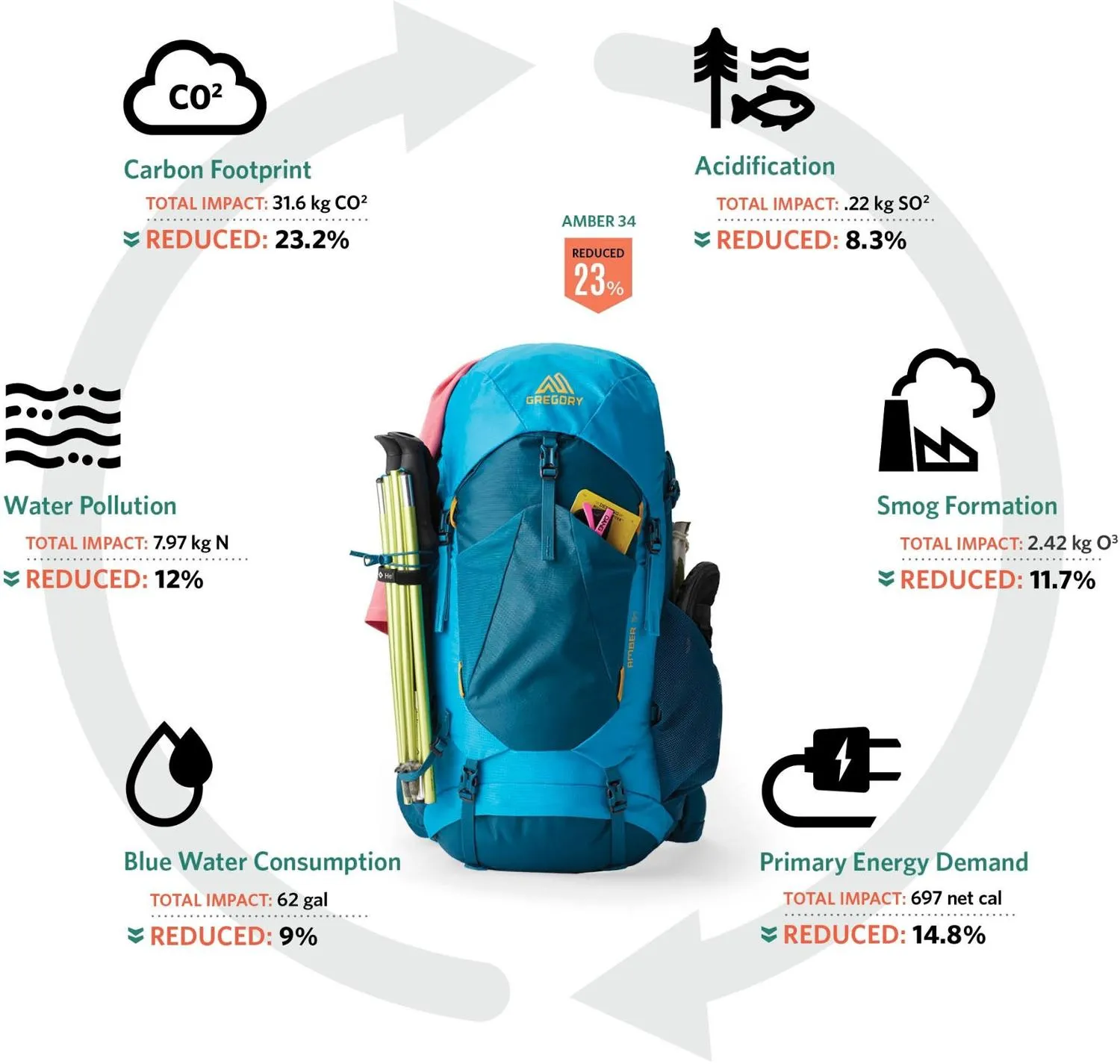 Материалы: основа: 40% Переработанного Нейлона 210 дений/420 дений высокоплотного Нейлона; дно: 420 дений высокоплотного Нейлона; подкладка: 40% Переработанного постпотребительского полиэстера 135 дений; подвеска: закрытая и открытая ячейка пены