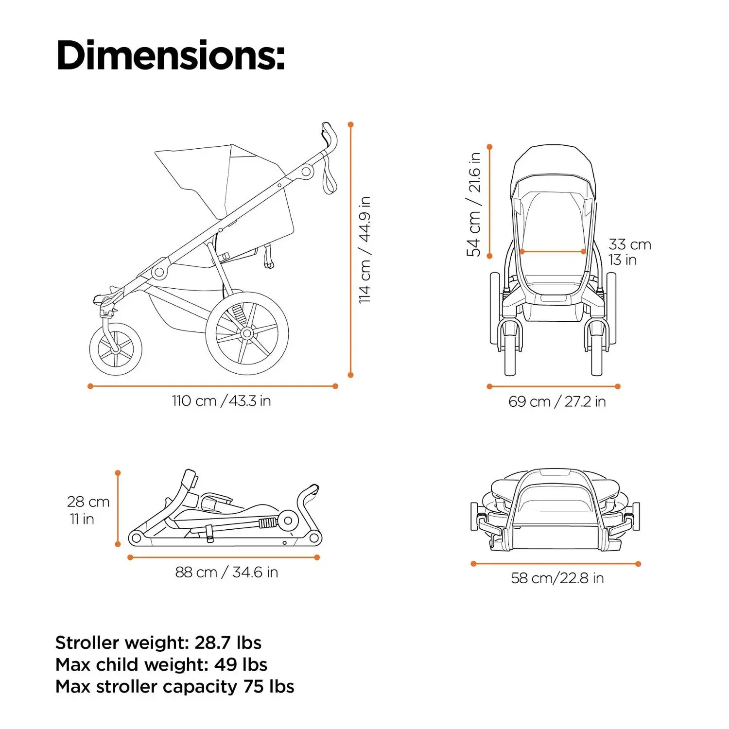 Передние колесики блокируются для более высоких скоростей; большие задние колеса делают коляску легкой и простой в управлении. Встроенная подножка и комфортное сиденье с регулируемым наклоном обеспечивают ребенку полный комфорт на протяжении всего дня, как для наблюдения за окружающими, так и для того, чтобы вздремнуть. Качественная подвеска и надувные шины обеспечивают плавный ход на любой местности как для родителя, так и для ребенка. Поворотный ручной тормоз обеспечивает оптимальный контроль скорости как на асфальте, так и на холмистой местности. Легкий, складной механизм одной рукой с функцией самостояния для удобного хранения и транспортировки. Большой козырек с полной защитой и вентиляцией обеспечивает комфорт вашему ребенку. Большая корзина для груза вмещает до 22 фунтов (10 кг) с закрывающимся верхом на молнии. Корзина для груза, задний карман из сетки и 2 сетчатых отделения для закусок или игрушек предоставляют достаточно места для всего необходимого. Эргономичный, регулируемый поручень для максимального комфорта родителя. Безопасное и удобное сиденье с легко регулируемым, мягким 5-точечным ремнем безопасности. Отражающий элемент на козырьке и. Колеса обеспечивают видимость и безопасность. Окно "Пикабу" позволяет вам проверить своего спящего ребенка, не отвлекая его.