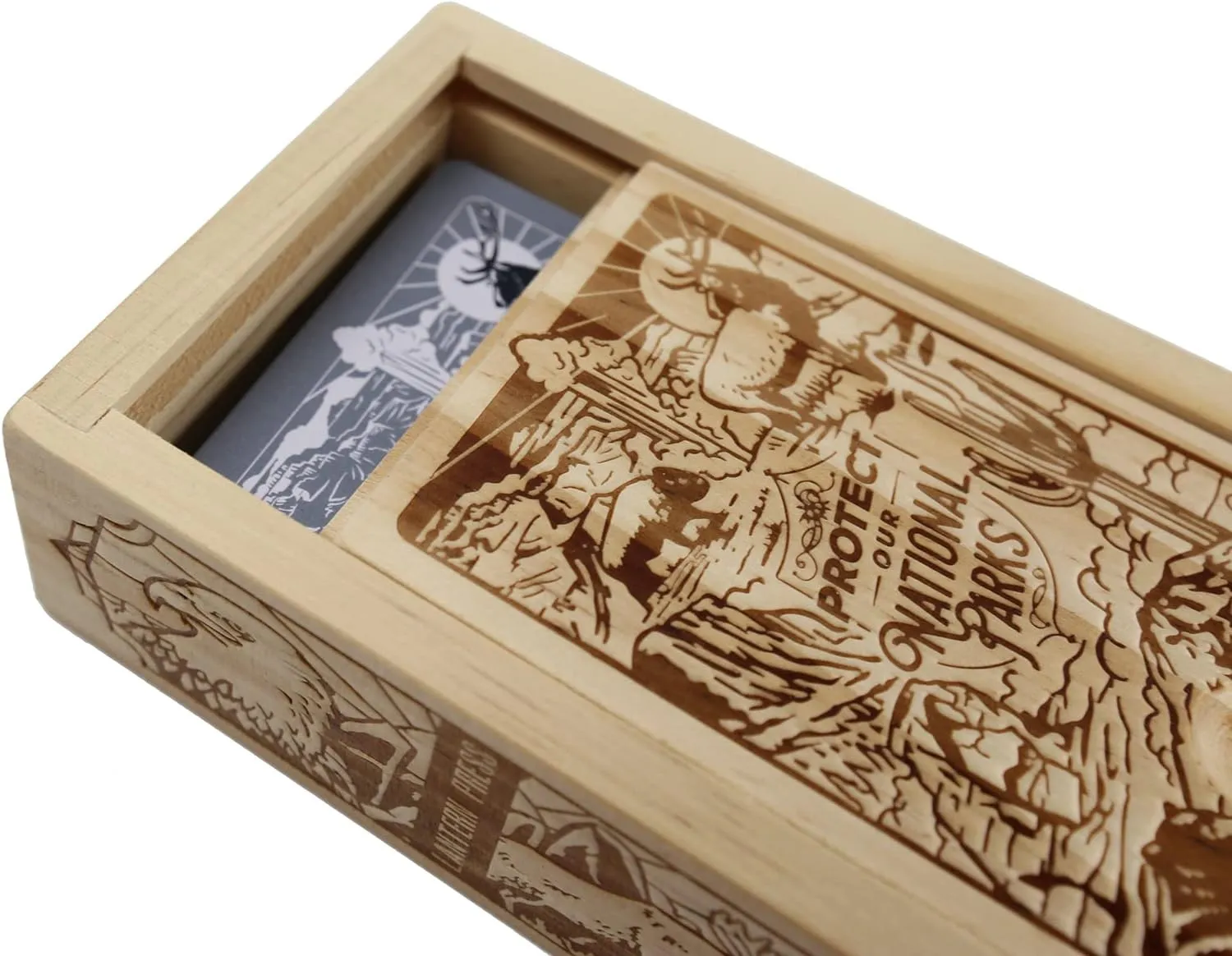 Лице каждой игральной карты украшено уникальными изображениями 55 красивых пейзажей национальных парков. Храните свои игральные карты в тисненом коллекционном ящике из сосны с выдвижной крышкой.