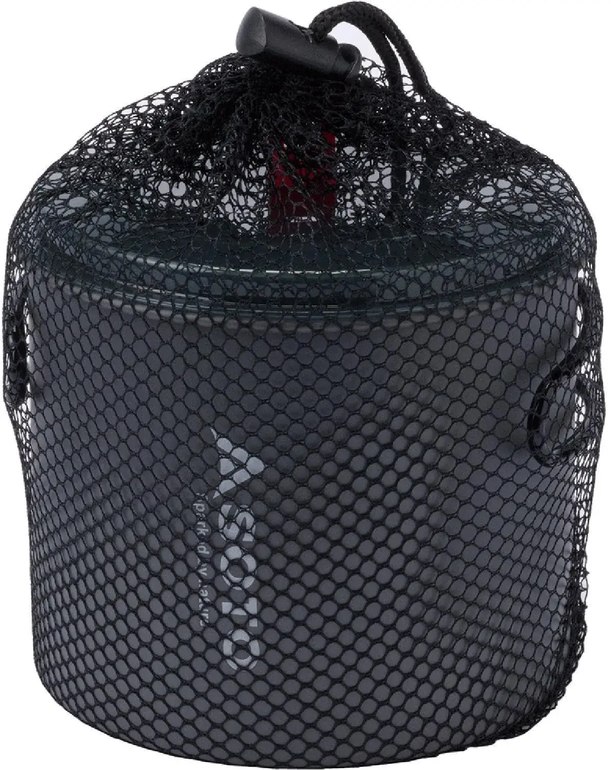 Кастрюля может вмещать один 110 г газовый баллон и небольшую туристическую плиту (горючее и газ не включены)