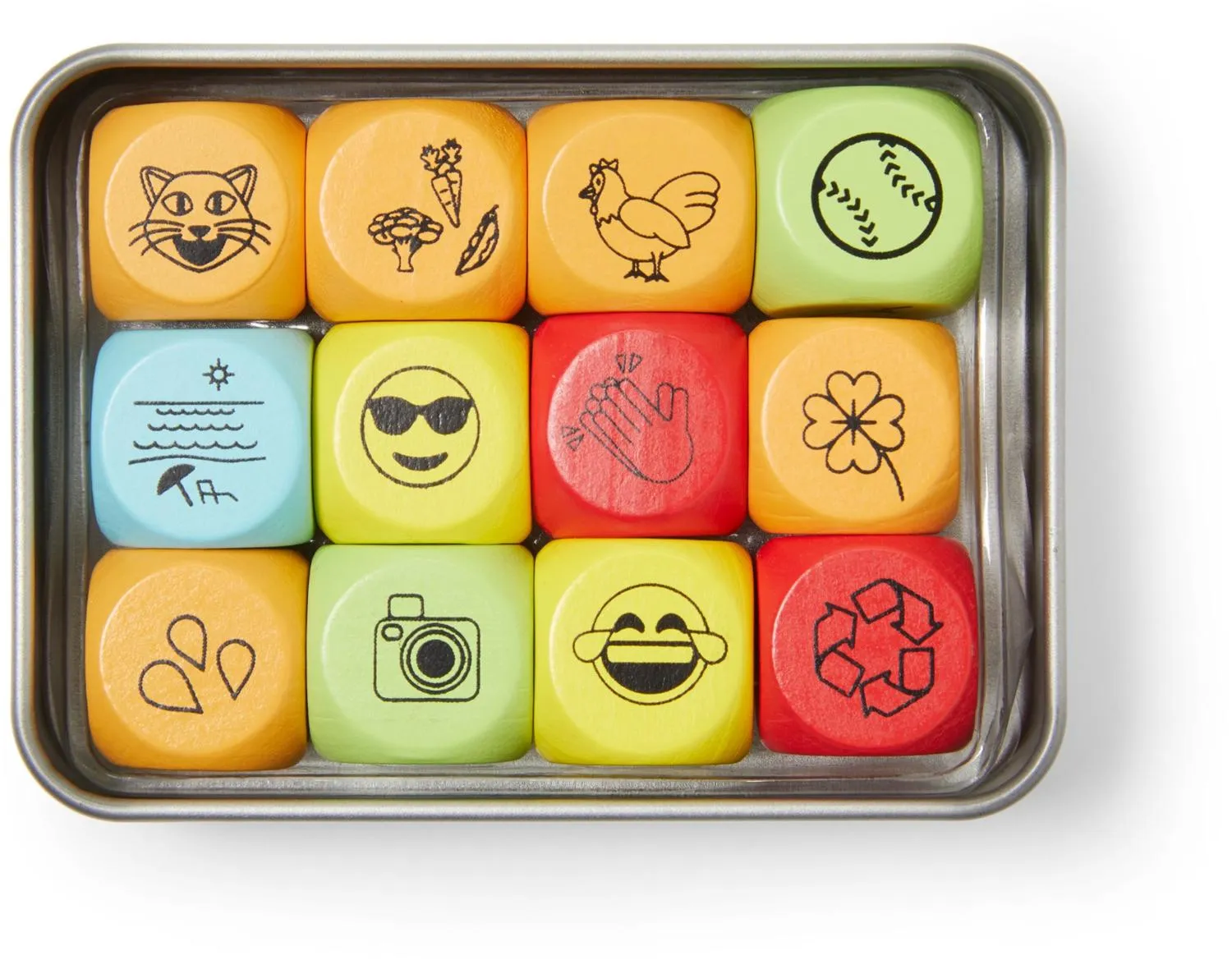 Если вам нужно помочь начать, кости цвет-coded по темам (например, оранжевый для вещей, синий для мест и т.д.)