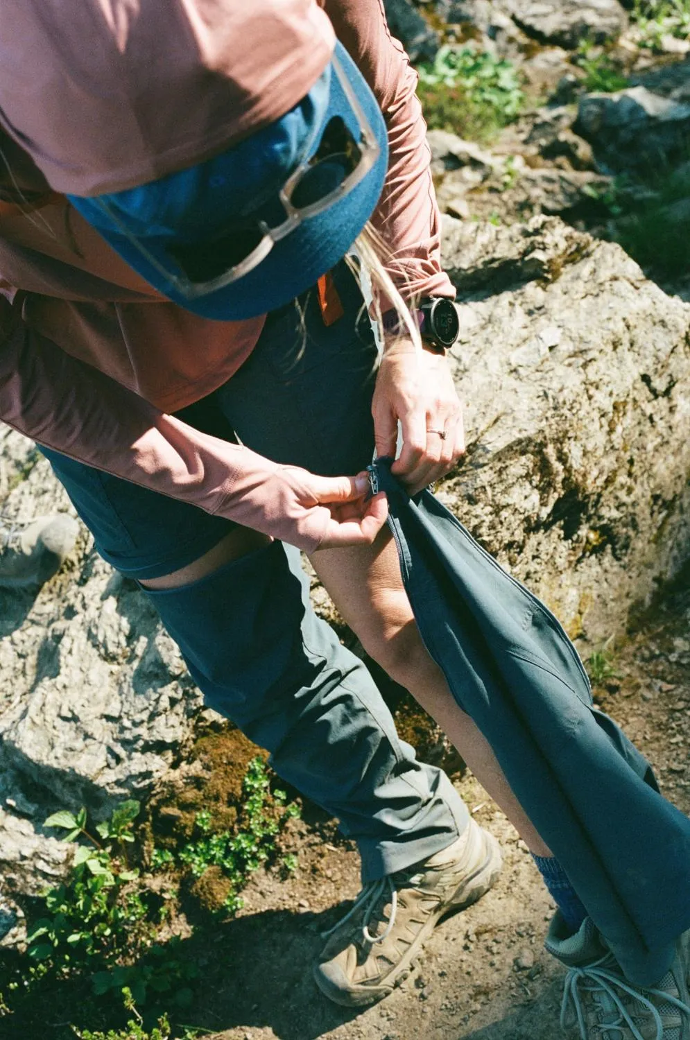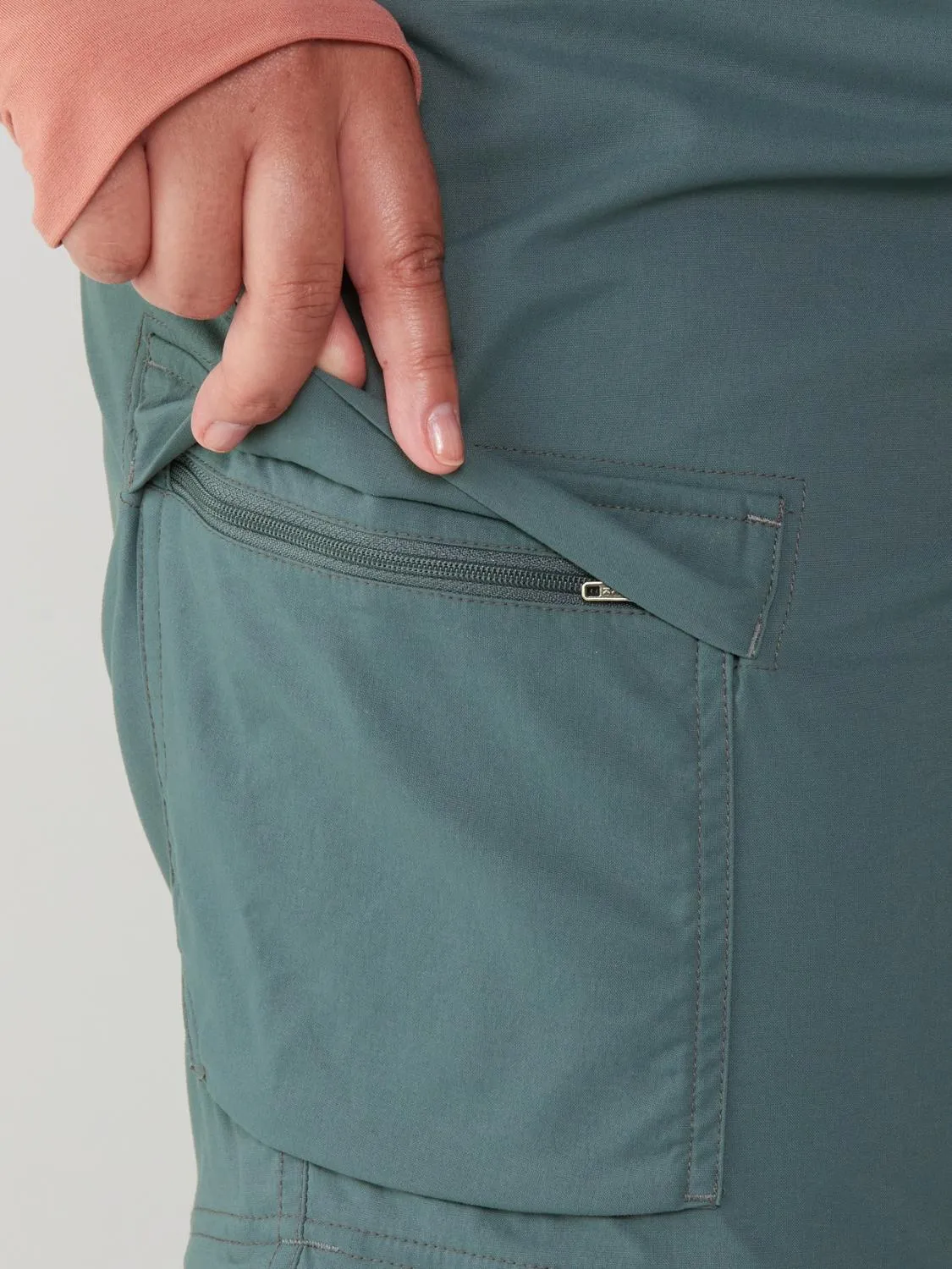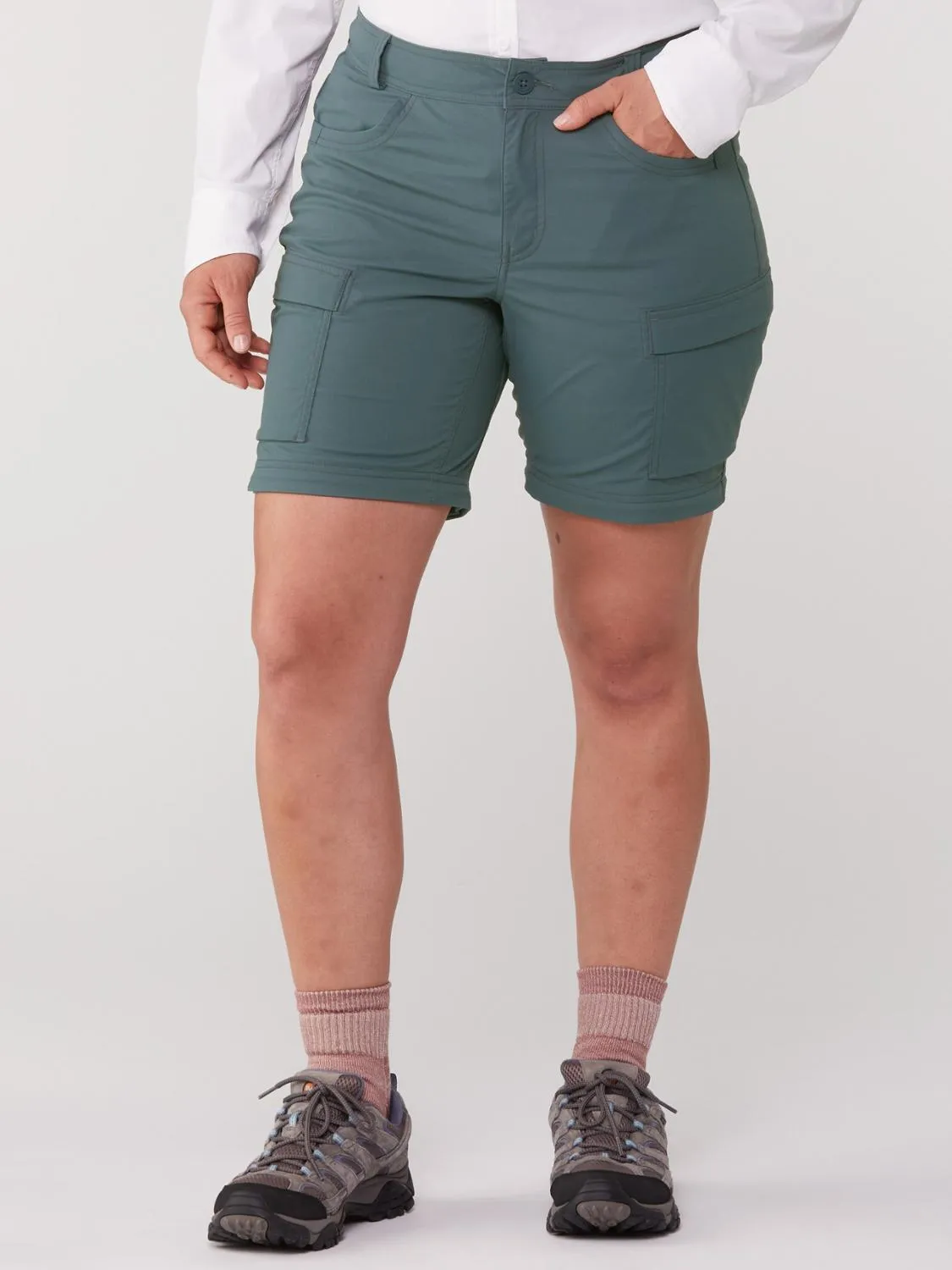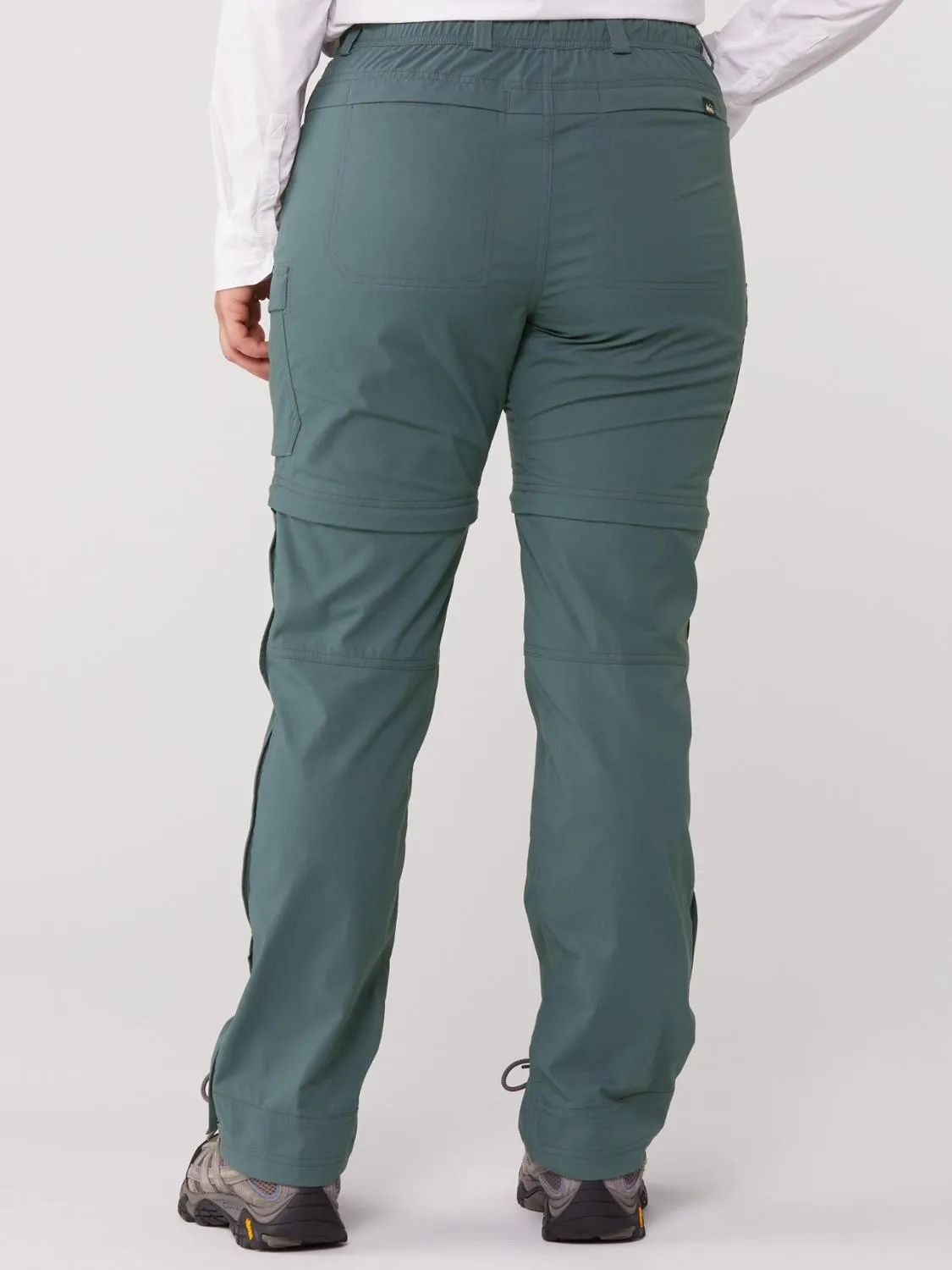 Штаны превращаются в шорты с помощью молний на бедрах, обозначенных по цветам, для легкого повторного прикрепления.