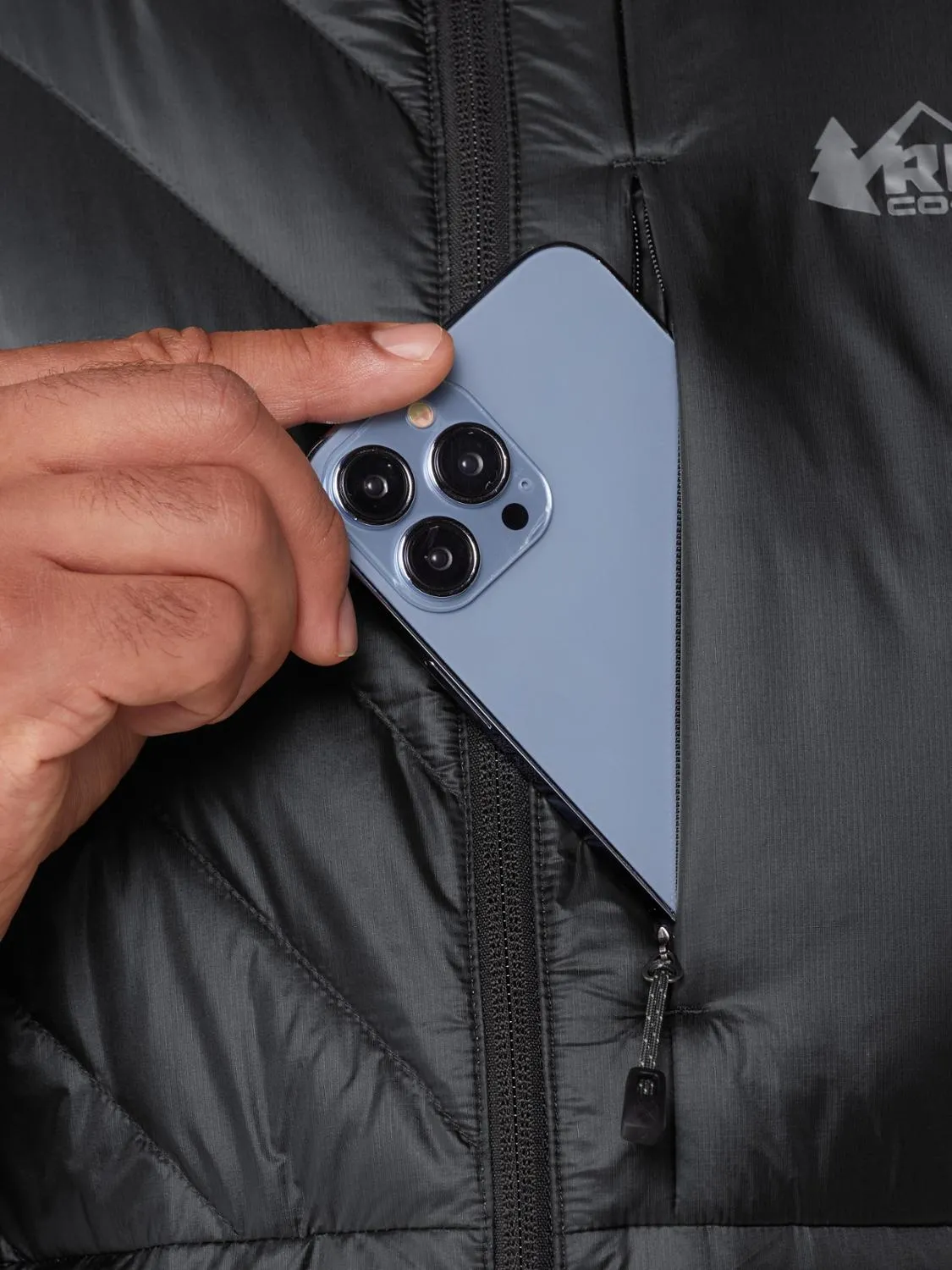 Карман на молнии на груди использует гибридный утеплитель с полиэстером (98% Переработанным), чтобы помочь сохранить заряд батареи вашего устройства в холоде