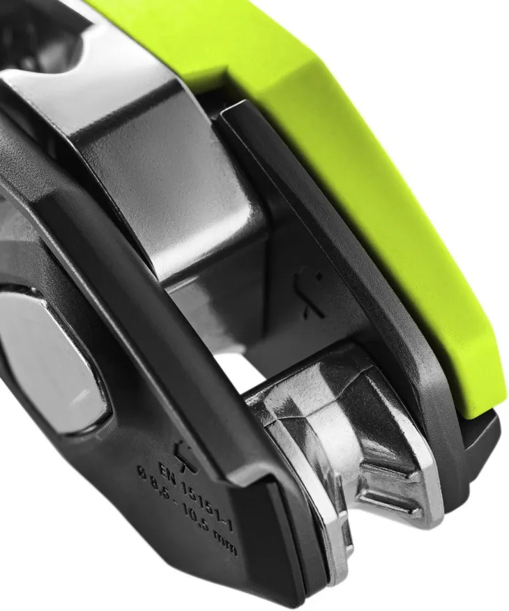 Устройство можно соединить с петлёй для страховки с помощью замкового карабина (не входит в комплект) или непосредственно с самой петлёй для страховки. Прямое соединение с петлёй снижает риск перекрестной нагрузки, поскольку исключает карабин из системы страхующего. Это также настраивает устройство ближе к телу страхующего и добавляет значительный контроль во всех аспектах страхования. Увеличивает способность страхующего выдавать верёвку при ведении на 4 до 7 дюймов, одновременно сокращая расстояние, на которое может упасть ведущий скалолаз, на 8 до 14 дюймов. Подходит для динамических верёвок диаметром от 8.5 до 10.5 мм. Подходит для статических верёвок диаметром от 10.0 до 10.5 мм (120 кг). Сталь на всех основных точках износа, предотвращает накопление оксида алюминия и увеличивает долговечность. Включает функцию Анти-Паника, которую можно отключить, вставив маленький винт, предоставленный в оригинальной упаковке, в рукоятку устройства. Запирающий механизм имеет дополнительную красную линию, которая, если видна, предупреждает пользователя о том, что устройство не. правильно закрыто
