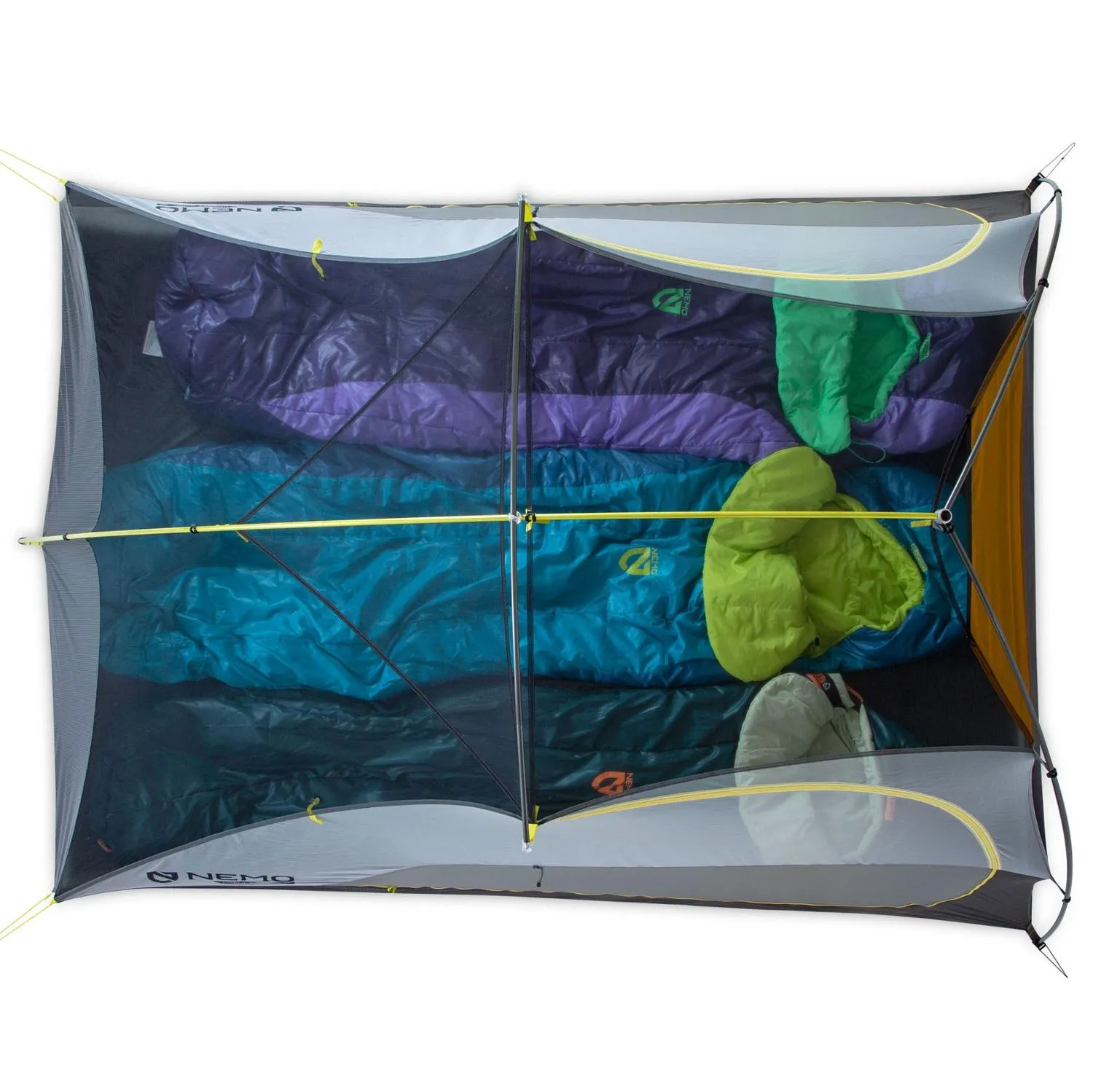 Треугольные объемные точки крепления и стойки в углах увеличивают объем внизу, защищая спальные мешки от палатки. Конденсация на стенах