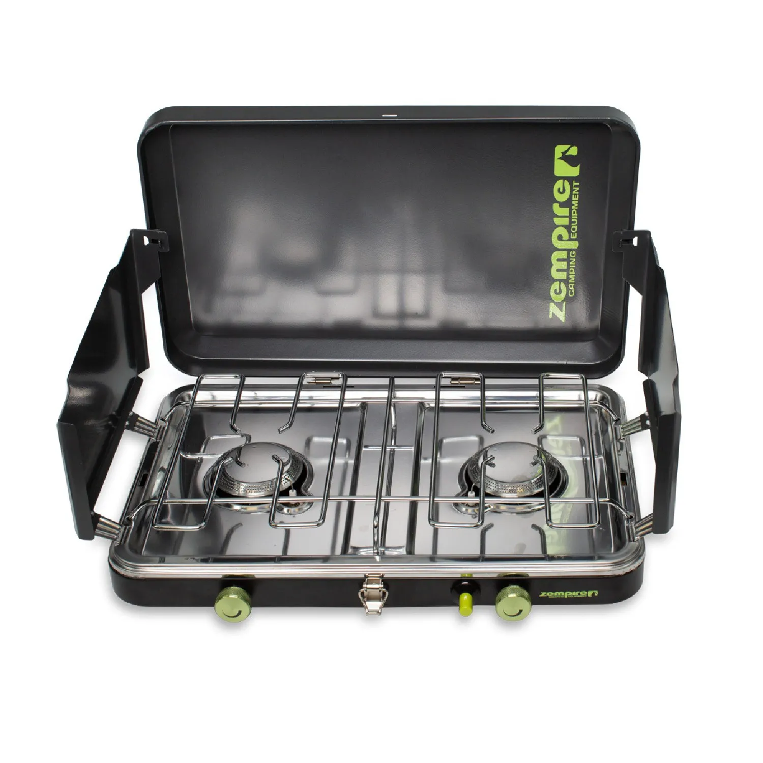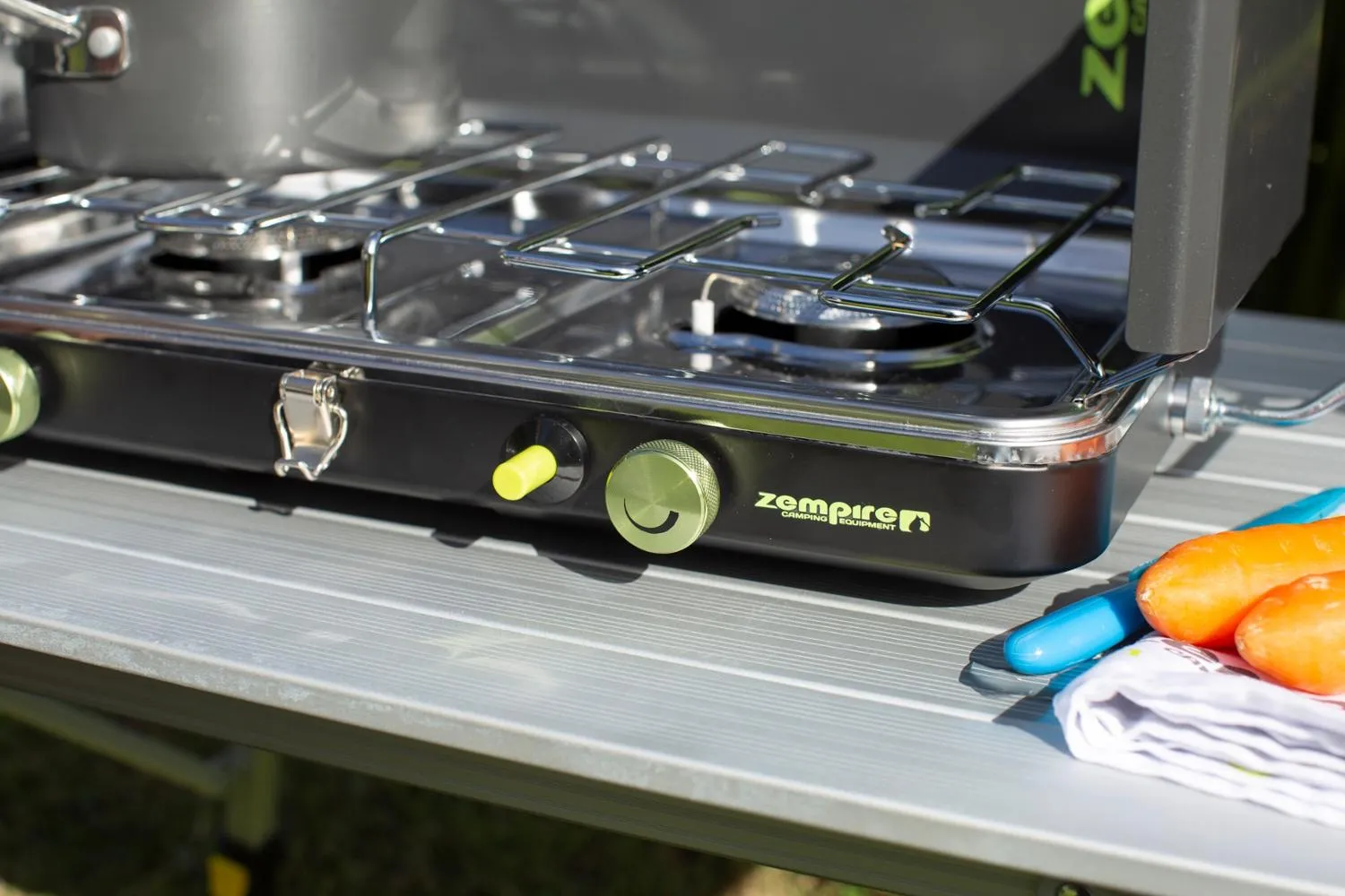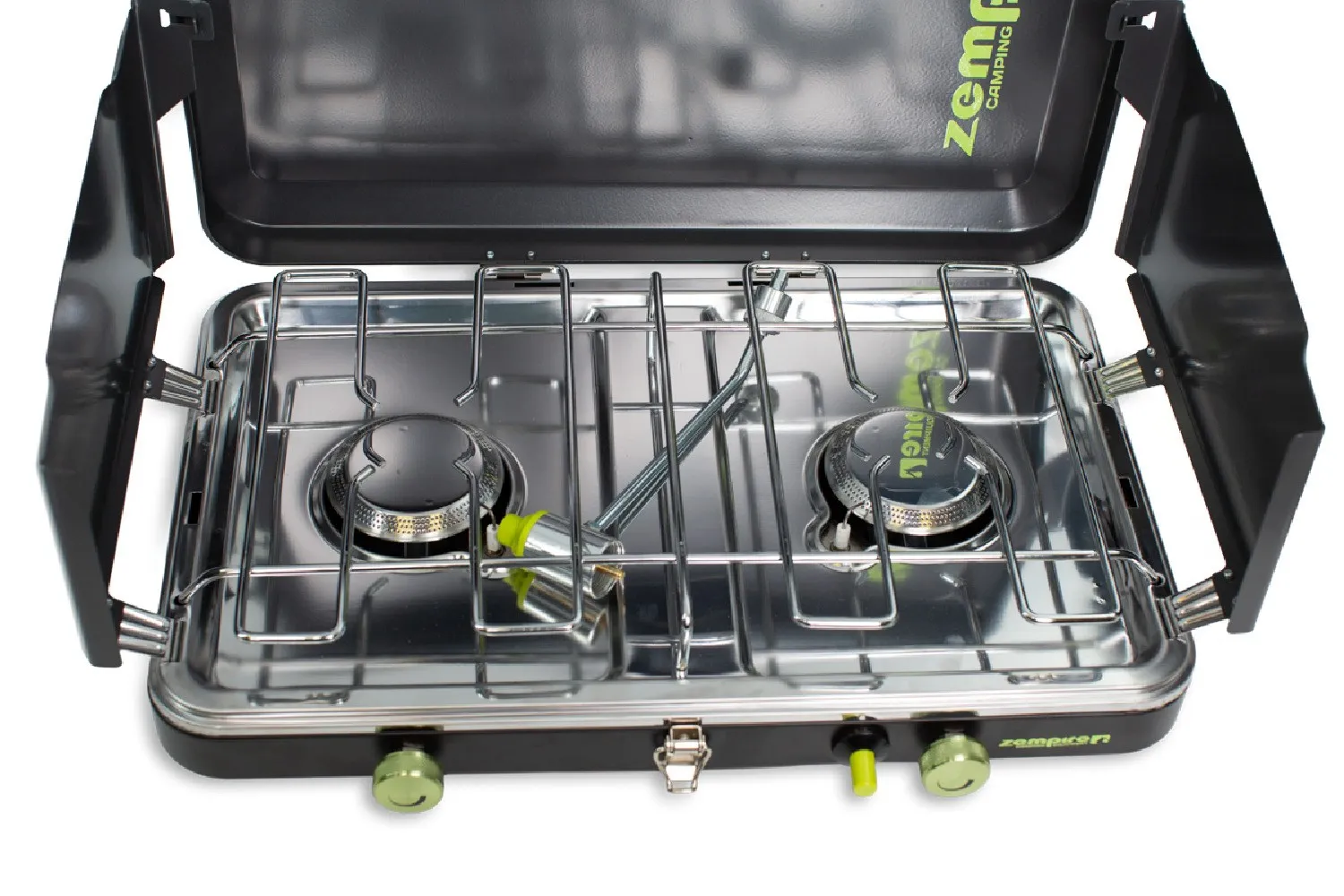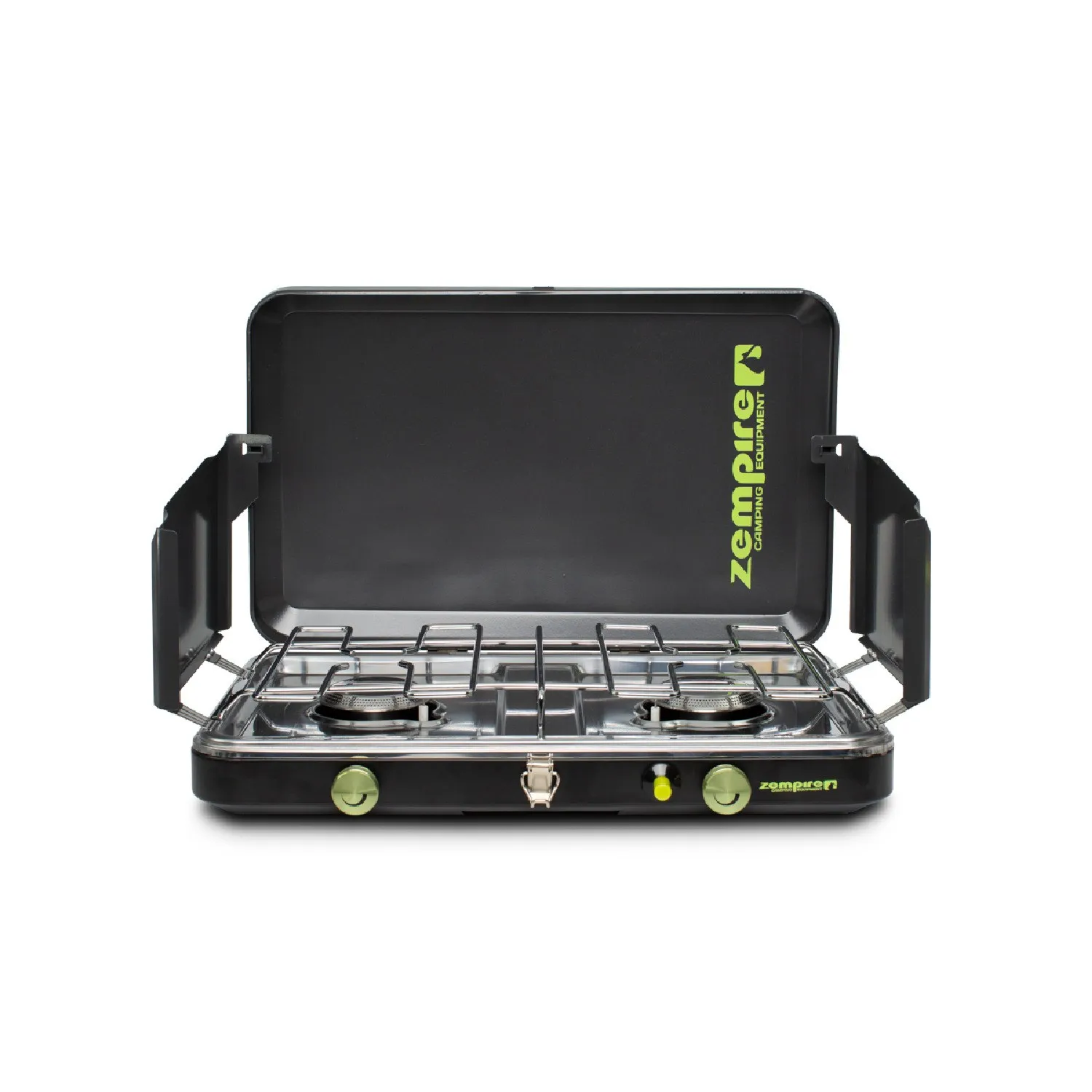 Когда вы хотите быстро накормить голодных туристов, портативная плита Zempire 2-Burner DLX поможет вам справиться с задачей. У неё есть ножки для устойчивости во время готовки, а также складной ветровой экран, чтобы поддерживать пламя горячим.