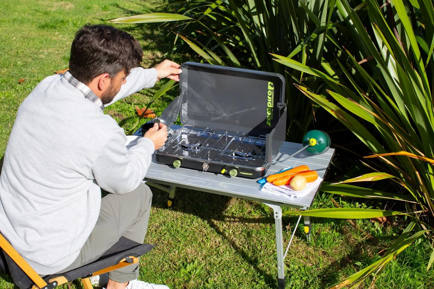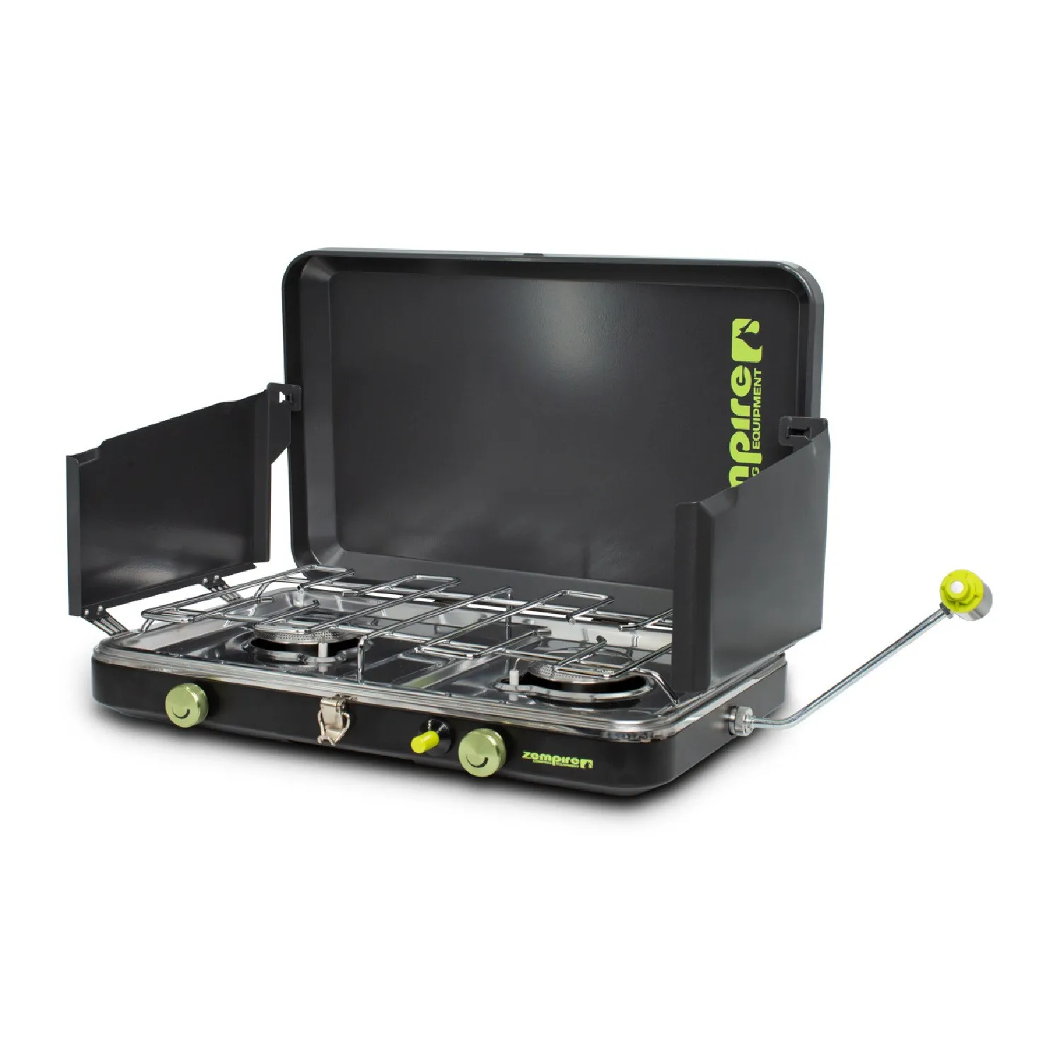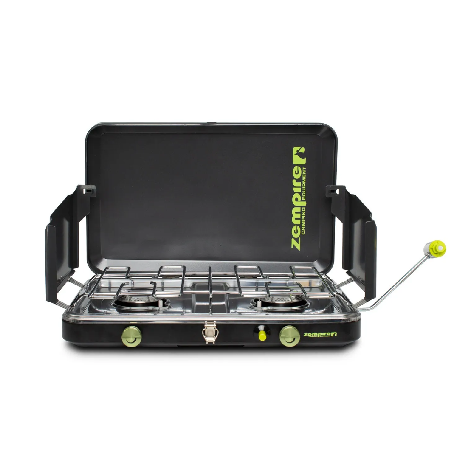 Когда вы хотите быстро накормить голодных туристов, портативная плита Zempire 2-Burner DLX поможет вам справиться с задачей. У неё есть ножки для устойчивости во время готовки, а также складной ветровой экран, чтобы поддерживать пламя горячим.