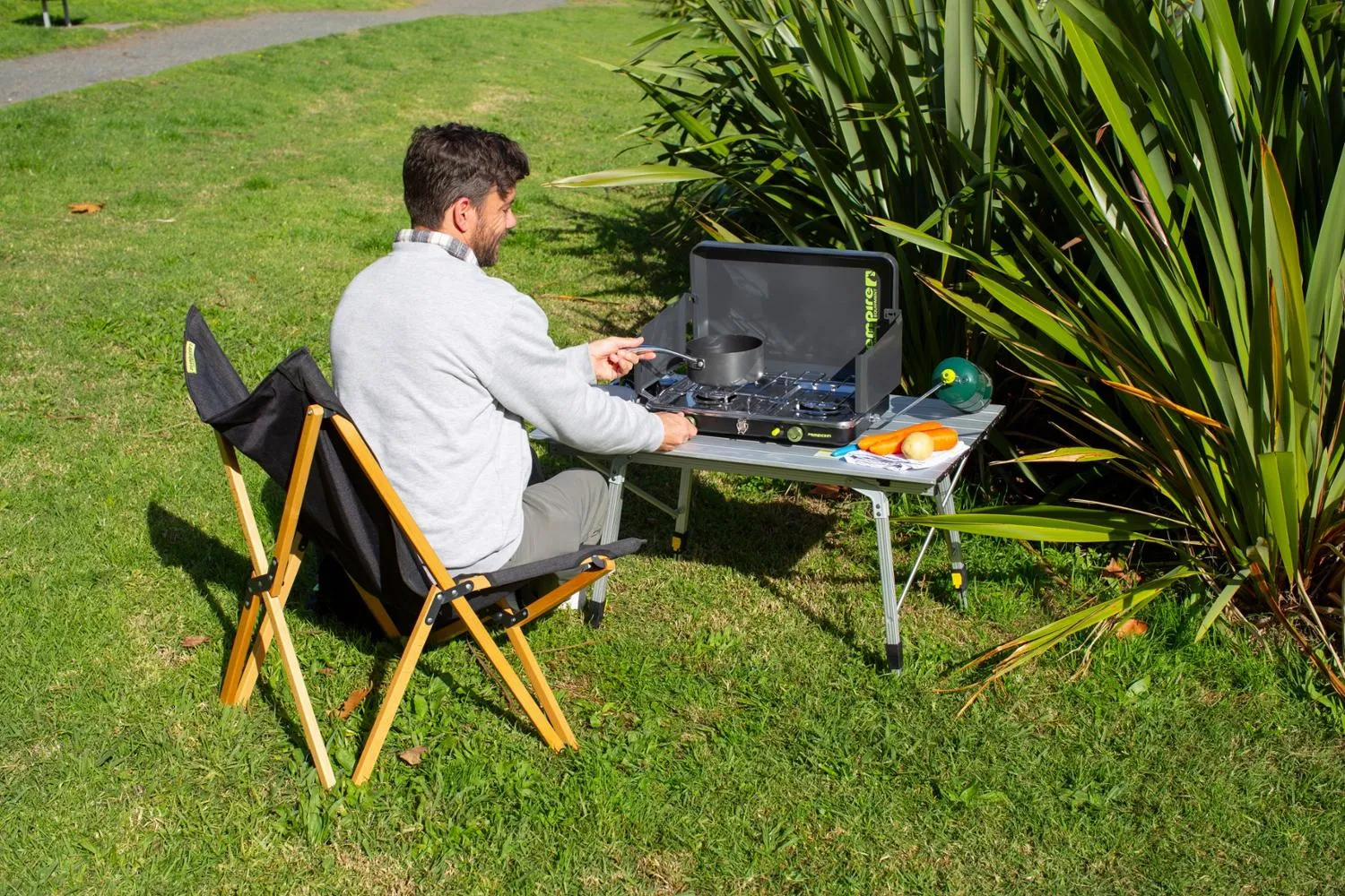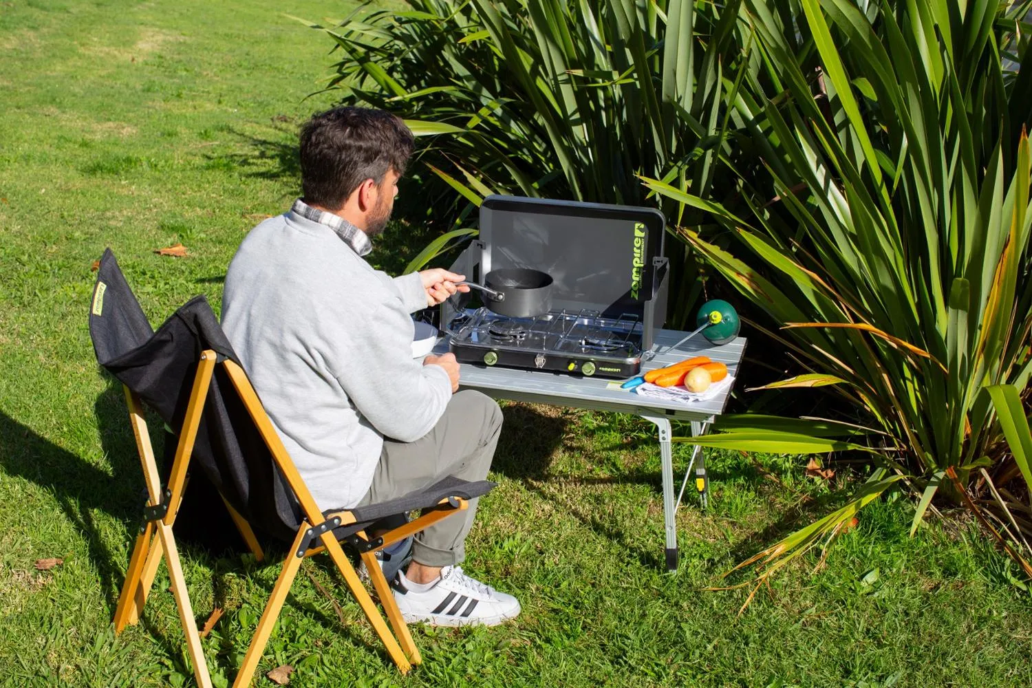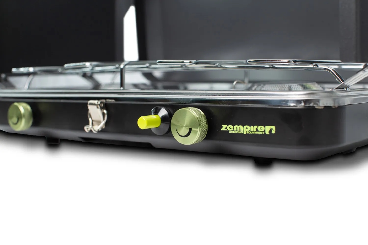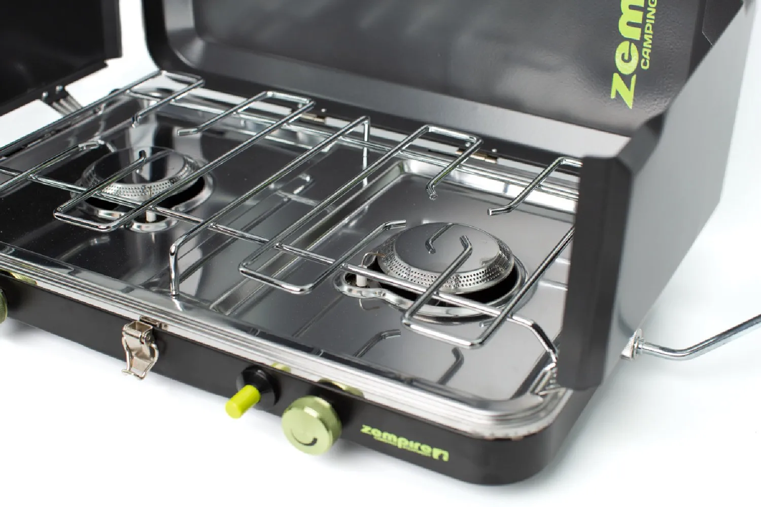 Когда вы хотите быстро накормить голодных туристов, портативная плита Zempire 2-Burner DLX поможет вам справиться с задачей. У неё есть ножки для устойчивости во время готовки, а также складной ветровой экран, чтобы поддерживать пламя горячим.
