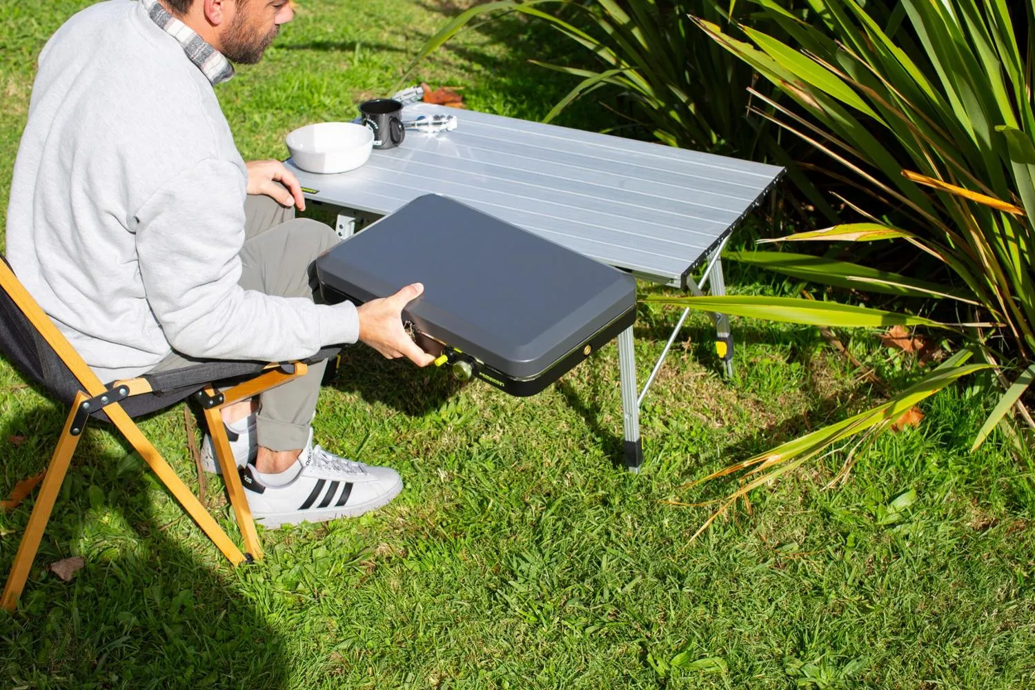 Дизайн «сложи и зафиксируй» облегчает переноску и защищает горелки, одновременно надежно фиксируя части установки