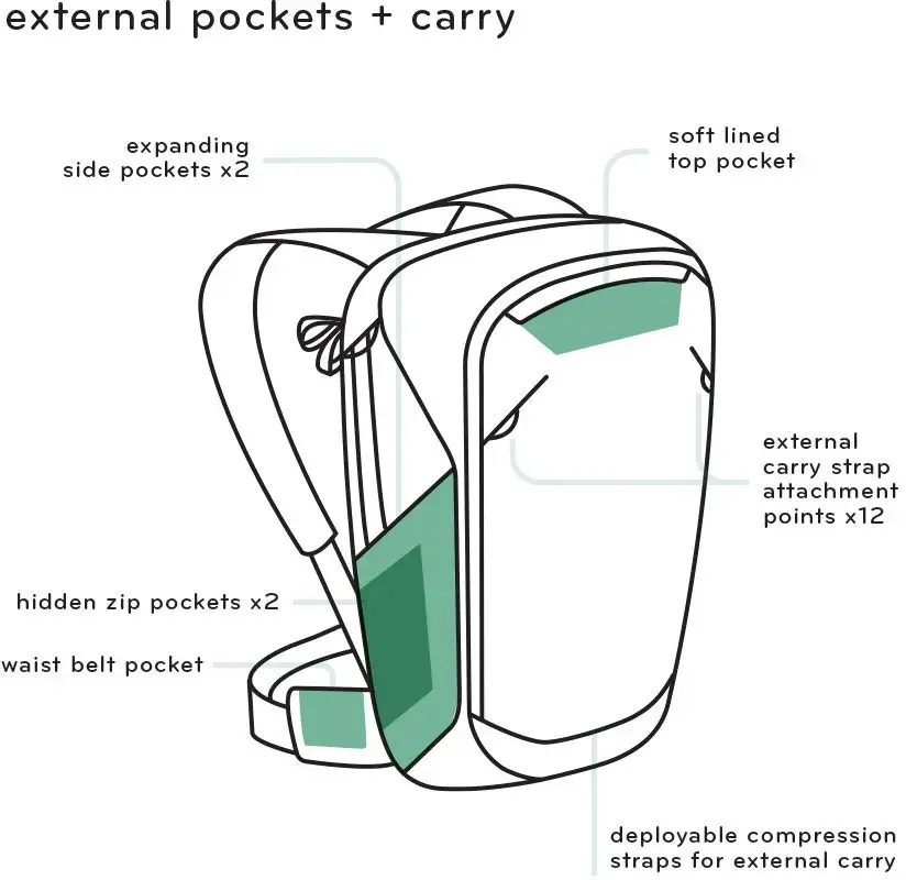 Стандартная вместимость 35 л, которая может расширяться до 45 литров или сжать до 30 литров; компрессионные застежки уменьшают профиль для использования в качестве дневной сумки