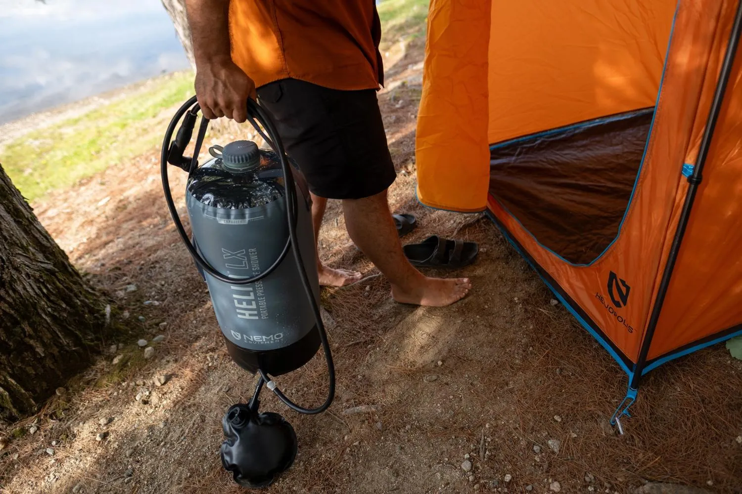 Отлично подходит для промывания грязной обуви, посуды и липких рук, 22-литровый душ под давлением NEMO Helio LX обеспечивает 7–10 минут непрерывной работы без необходимости в подвешивании или использовании силы тяжести.