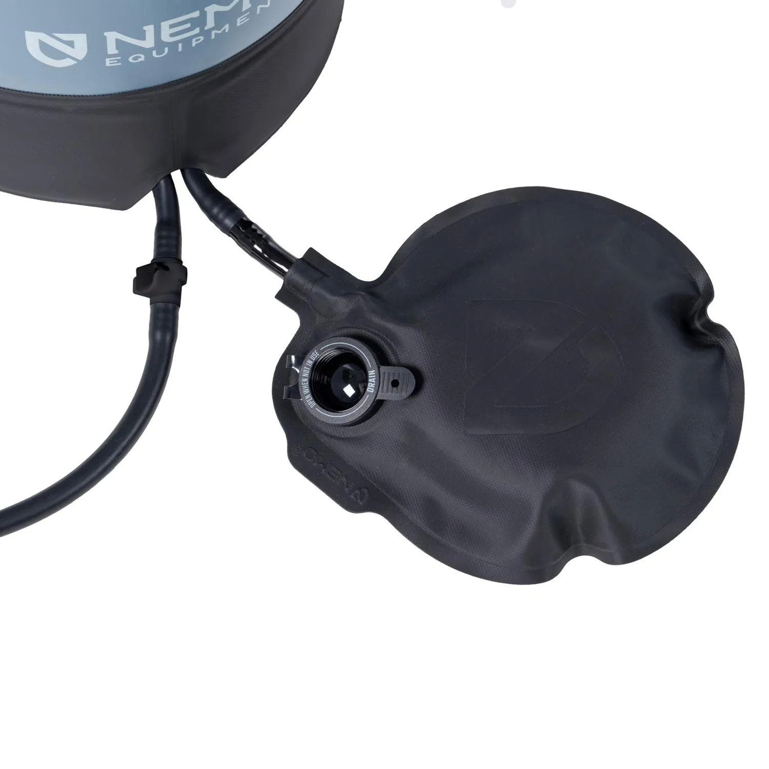 Вертикальный резервуар на 2,9 галлона (11 литров) оборудован большим отверстием и легкозахватываемой винтовой крышкой для легкой заправки и опустошения резервуара (без необходимости в шланге). Большое отверстие также помогает полностью высушить и очистить внутреннюю часть. Удобная ручка позволяет комфортно переносить резервуар к источнику воды и обратно. Нет необходимости в подвешивании; резервуар надежно стоит на земле и накачивается прилагаемым ножным насосом. Поскольку резервуар невозможно перекачать, легко поддерживать давление во время использования. Постепенно нагревается на солнце или может быть заполнен горячей водой для душа или мытья грязной посуды. Сконструирован для обеспечения 5–7 минут непрерывного, стабильного давления воды. 7-футовый неопрена шланг с 2-ступенчатой насадкой, которая может быть вручную активирована или установлена в режим непрерывного распыла для таких задач, как душ или посуду в кемпе. Удлиненный шланг предназначен для дополнения укрытия NEMO Heliopolis и душевого тента (не входит в комплект), который имеет встроенный держатель для насадки для душа без помощи рук. Когда придет время... Упакуйте, душ с давлением складывается в компактный размер, а шланг и ножной насос аккуратно помещаются под его основание до следующего использования.