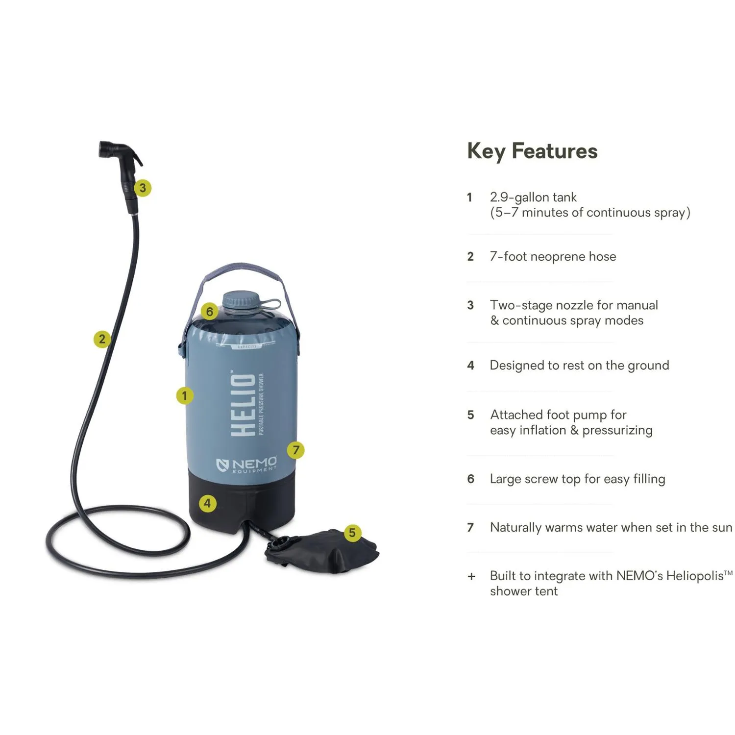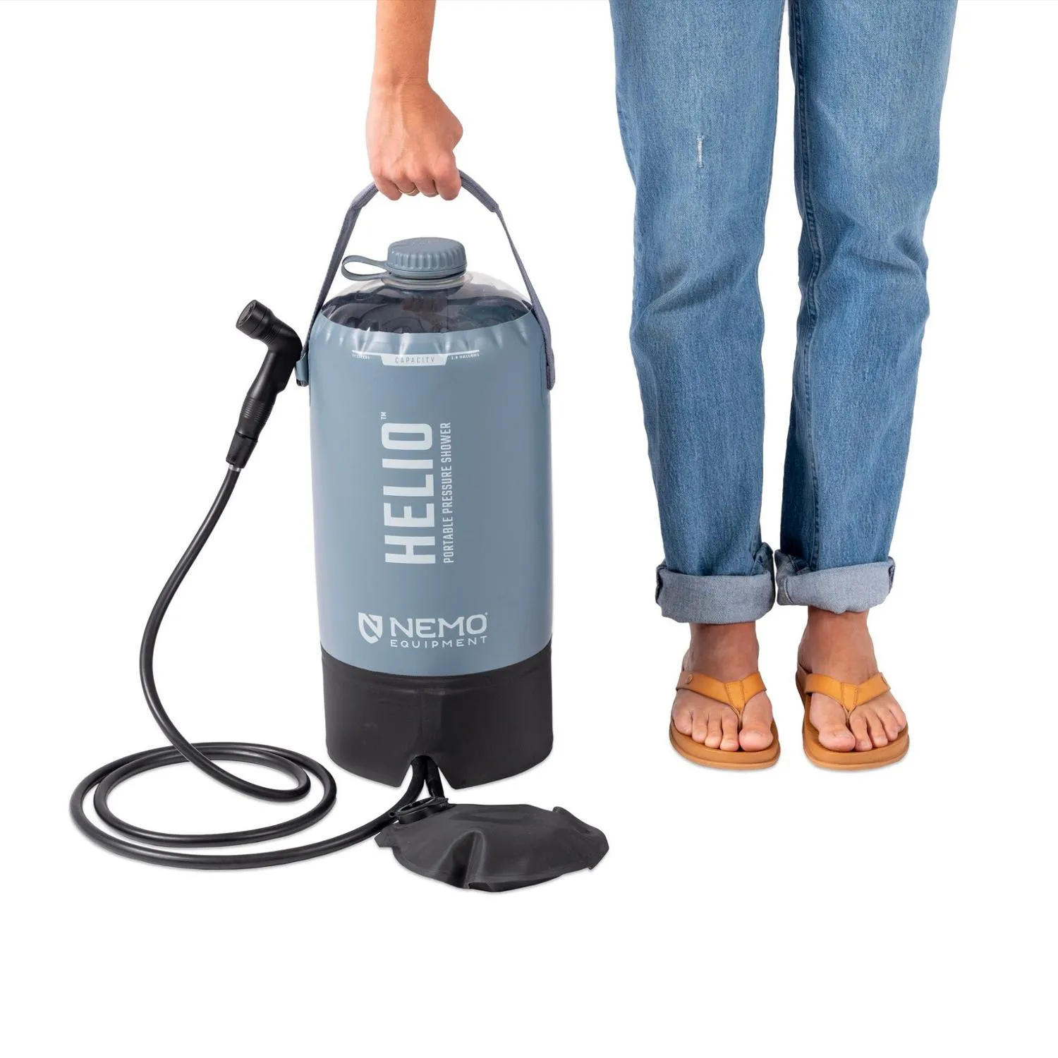 Отлично подходит для ополаскивания грязной посуды, липких рук и грязных обуви, 11-литровый душ под давлением NEMO Helio обеспечивает 5–7 минут непрерывной струи без необходимости в подвешивании или зависимости от силы тяжести.