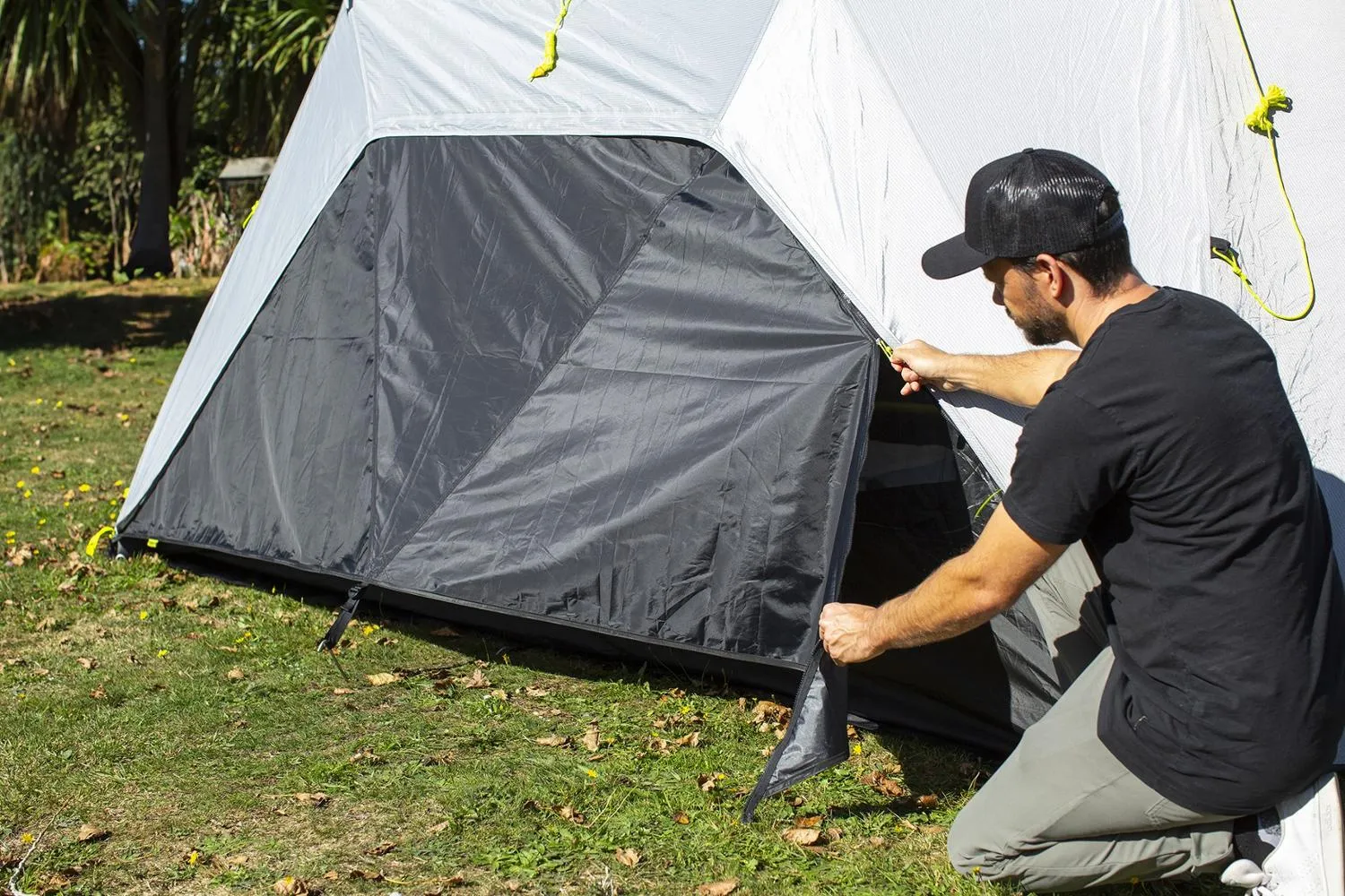 Просто застегните каждую стену на боках аэродинамической палатки, чтобы легко и надежно прикрепить