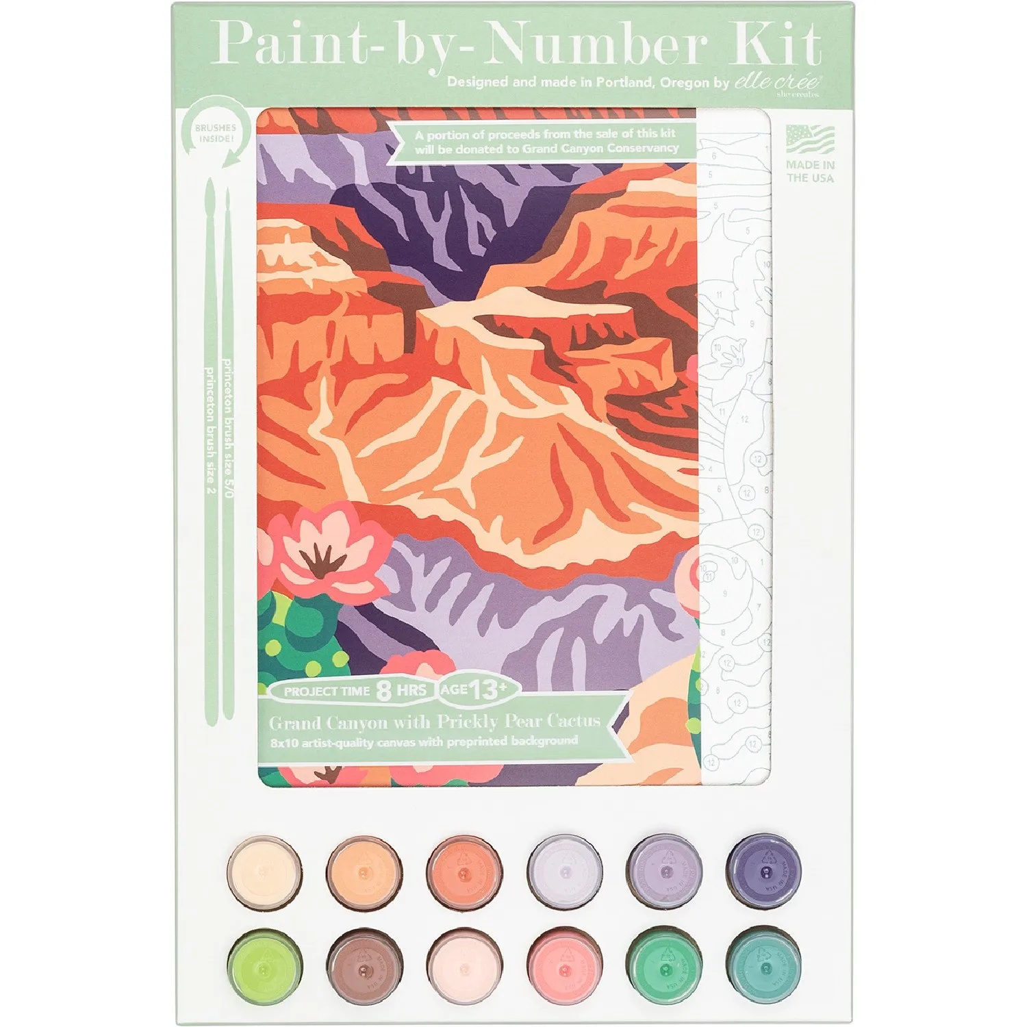Подчеркивает захватывающую красоту Гранд-Каньона, обрамленного одним из коренных растений региона — кактусом опунцией. Предварительно напечатанный фон представляет собой закат с розоватыми оттенками. Аэрозольная картина на 12 цветов может занять 8–10 часов для завершения. Рисование по номерам поощряет заботу о себе и благополучие, заставляя вас замедлиться, отключиться от медиа и заняться творческой деятельностью, способствующей внутреннему спокойствию. Рекомендуется для взрослых и подростков старше 13 лет. Включает холст размерами 8x10 дюймов, качественный, без подрамника с заранее напечатанным фоном, 12 акриловых красок, 2 синтетических кисти Princeton Brush из соболя и инструкции. Elle Cree жертвует часть доходов от продажи набора в Grand Canyon Conservancy - официальному philanthropic и совместному партнеру Национального парка Гранд-Каньон. Миссия Консервантов — вдохновлять поколения защитников парка ценить и поддерживать природное и культурное чудо Гранд-Каньона. Elle Cree заботится о. экологическое воздействие, связанное с каждым бизнес-решением, и стремление к ответственной и местной закупке компонентов продукции, когда это возможно