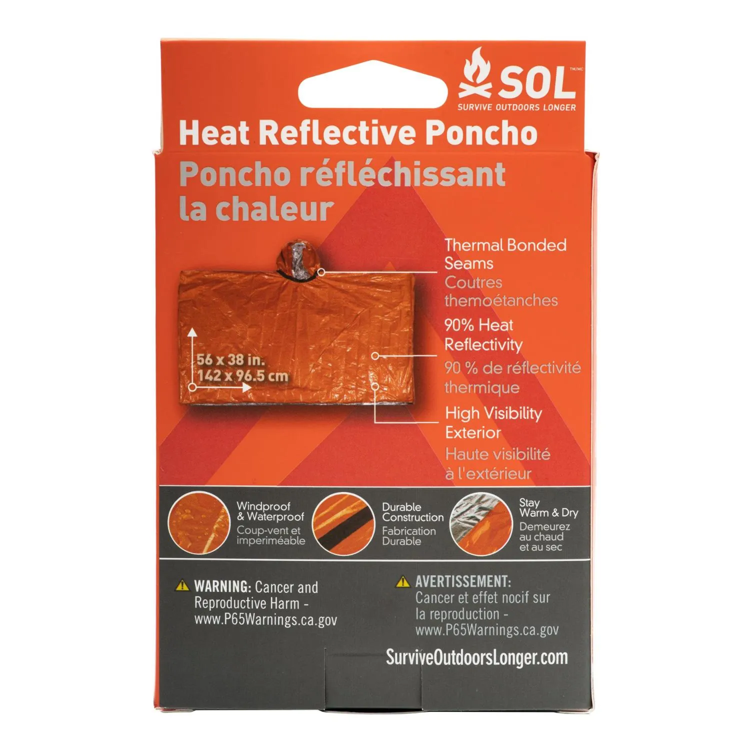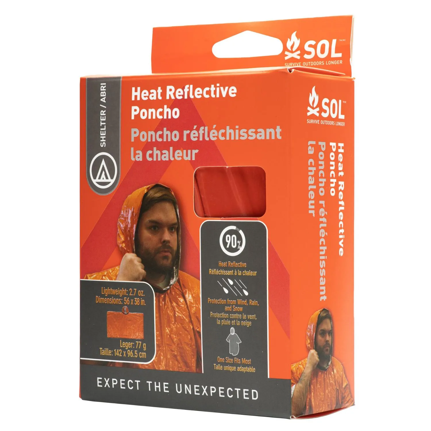 Компактный и легкий, пончо SOL с отражающим тепло материалом изготовлено на 90% из отражающего тепло материала, который защищает от дождя, ветра и разрывов, обеспечивая защиту от непогоды.