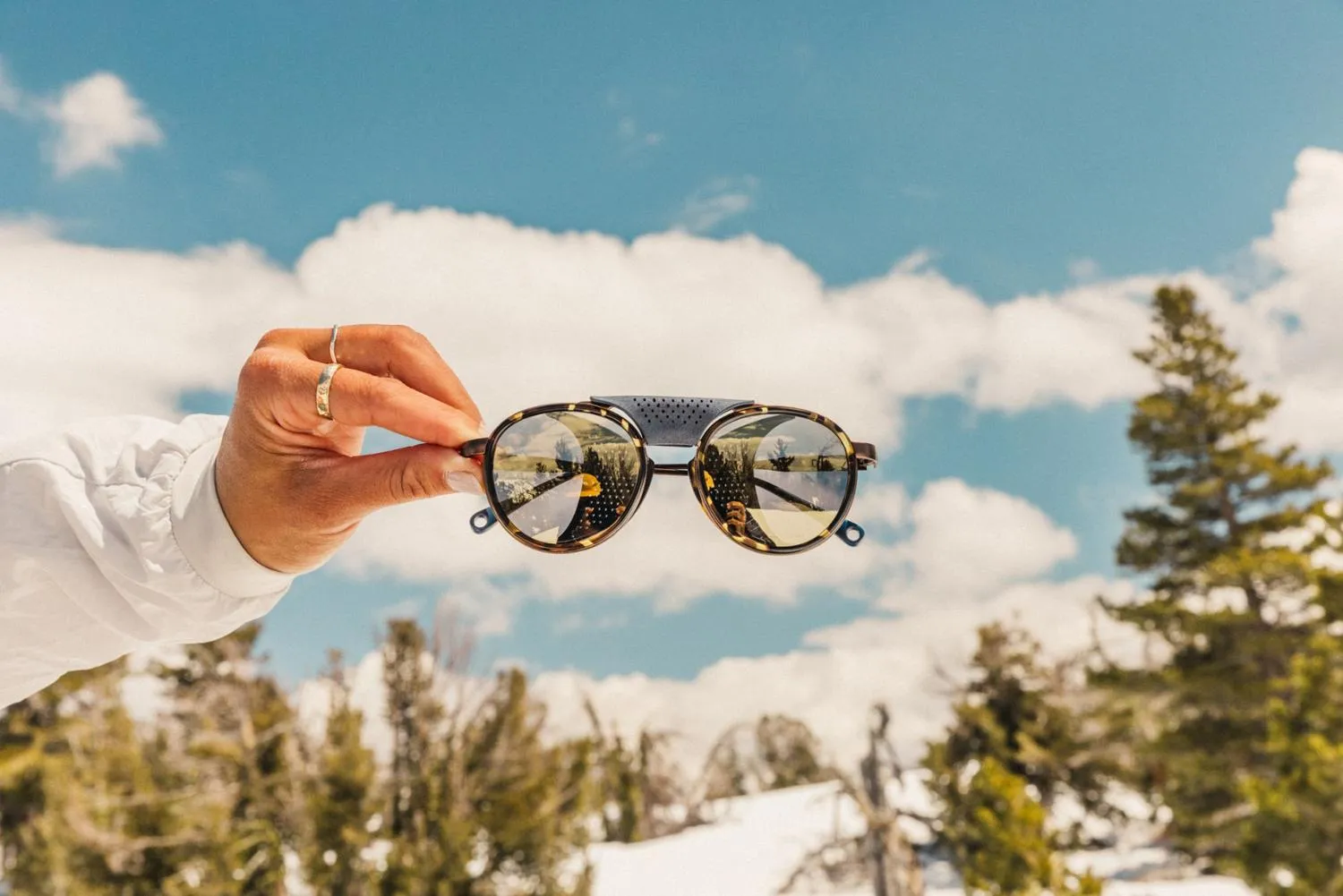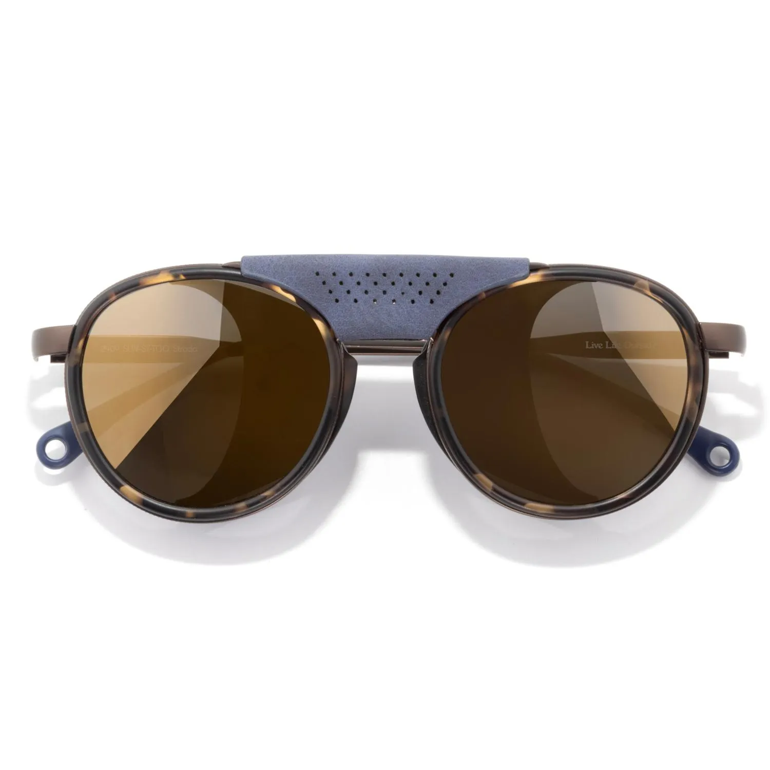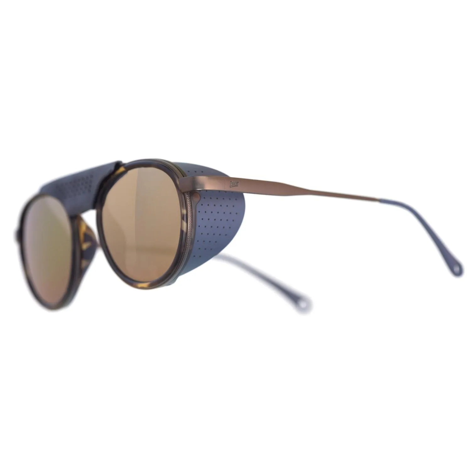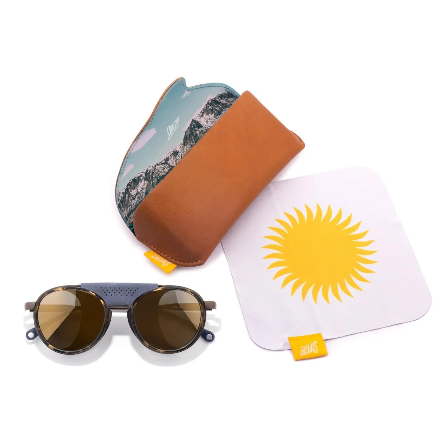 Выходите на снег в защитных солнечных очках Sunski Ferrata с поляризацией. Перфорированные боковые щиты с черными внутренностями блокируют блистание в солнечные дни, позволяя воздуху проходить.