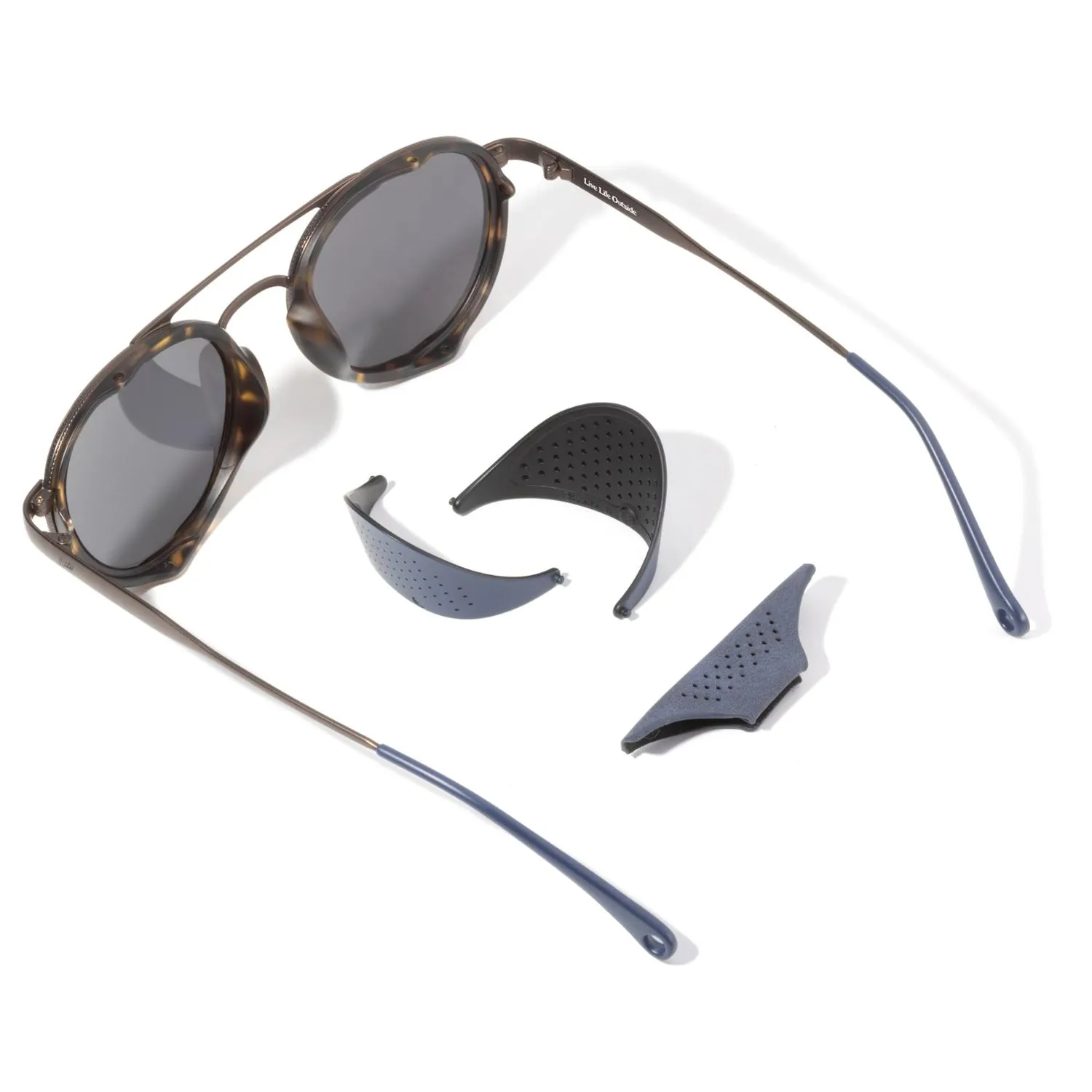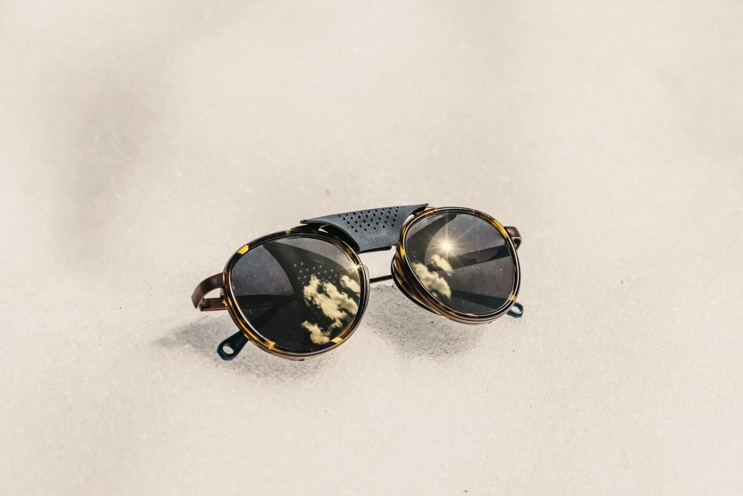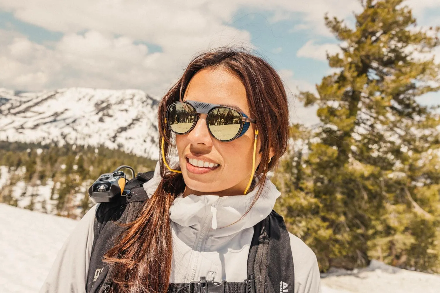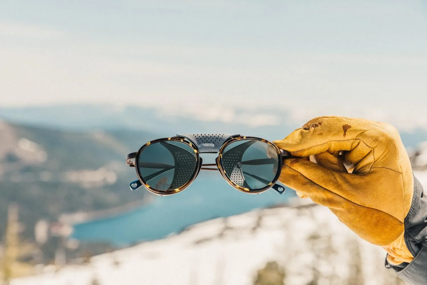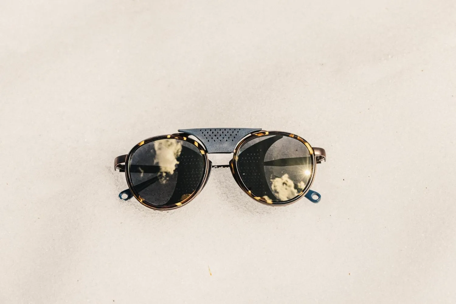 Выходите на снег в защитных солнечных очках Sunski Ferrata с поляризацией. Перфорированные боковые щиты с черными внутренностями блокируют блистание в солнечные дни, позволяя воздуху проходить.