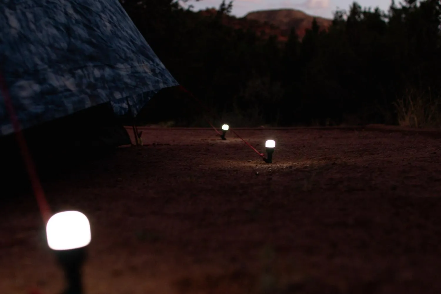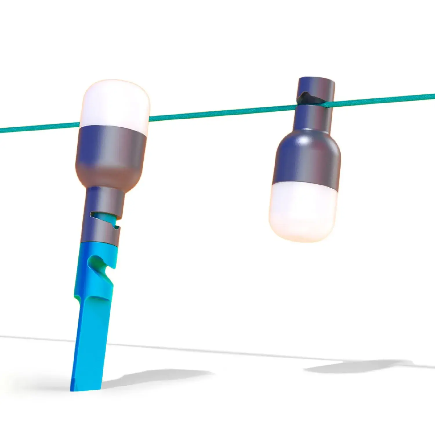 Используемые независимо от колышков, светильники могут висеть сверху, натягиваться на линии палатки или прикрепляться к карабину для освещения в пути