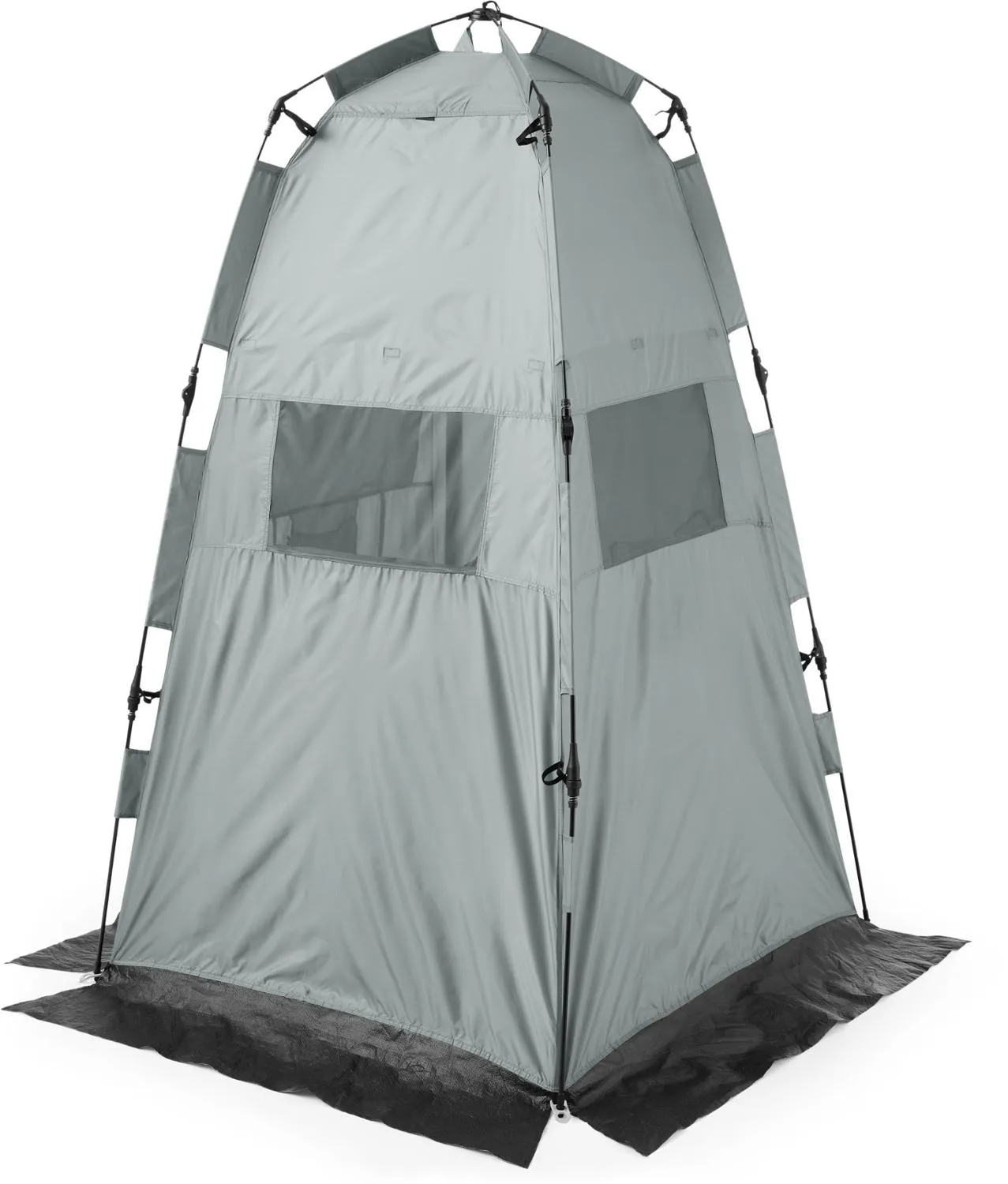 Высота укрытия 2 метра, есть застежка на молнии для уединения, основание без пола размером 1,2 на 1,2 метра для санитарных целей и 3 москитные окна для сквозной вентиляции