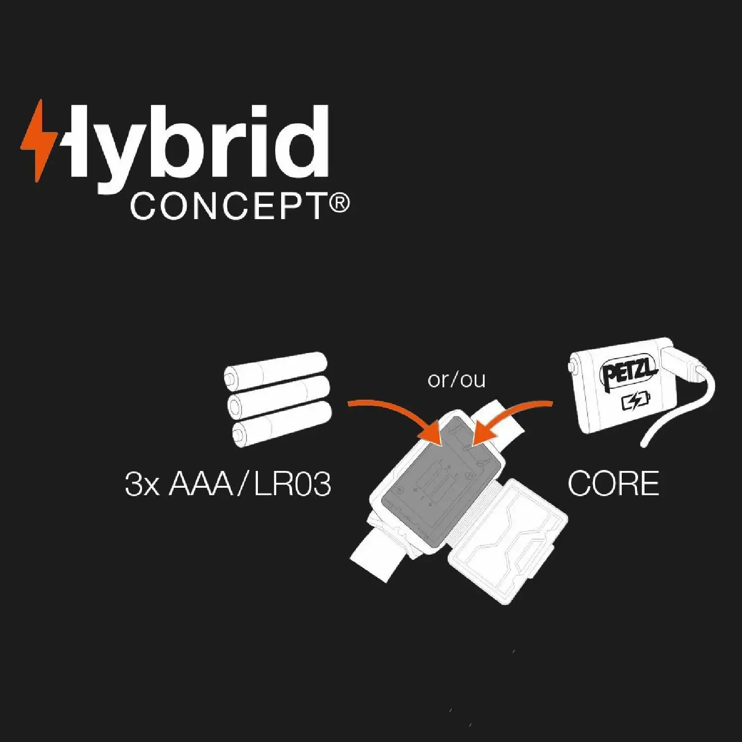 Поставляется с 3 стандартными батарейками AAA/LR03 и также работает с перезаряжаемой батареей Petzl Core (не входит в комплект) благодаря своему дизайну Hybrid Concept