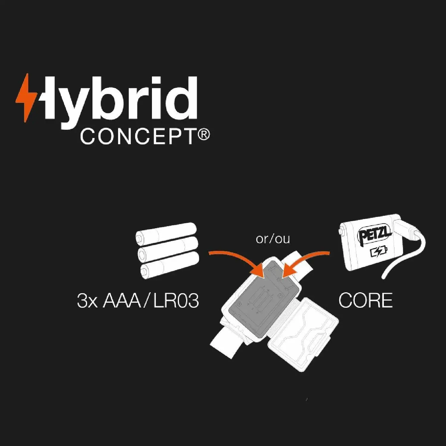 В комплект входит перезаряжаемая батарея Petzl Core, она также работает с 3 стандартными батареями AAA/LR03 (не входят в комплект), благодаря дизайну Hybrid Concept