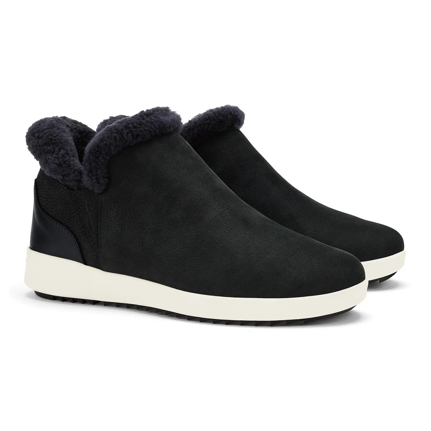 Гладкая водоотталкивающая нубуковая кожа, отделанная накладками из кожи с полным зерном на каблуках и полностью овечьим мехом для комфорта и поддержки