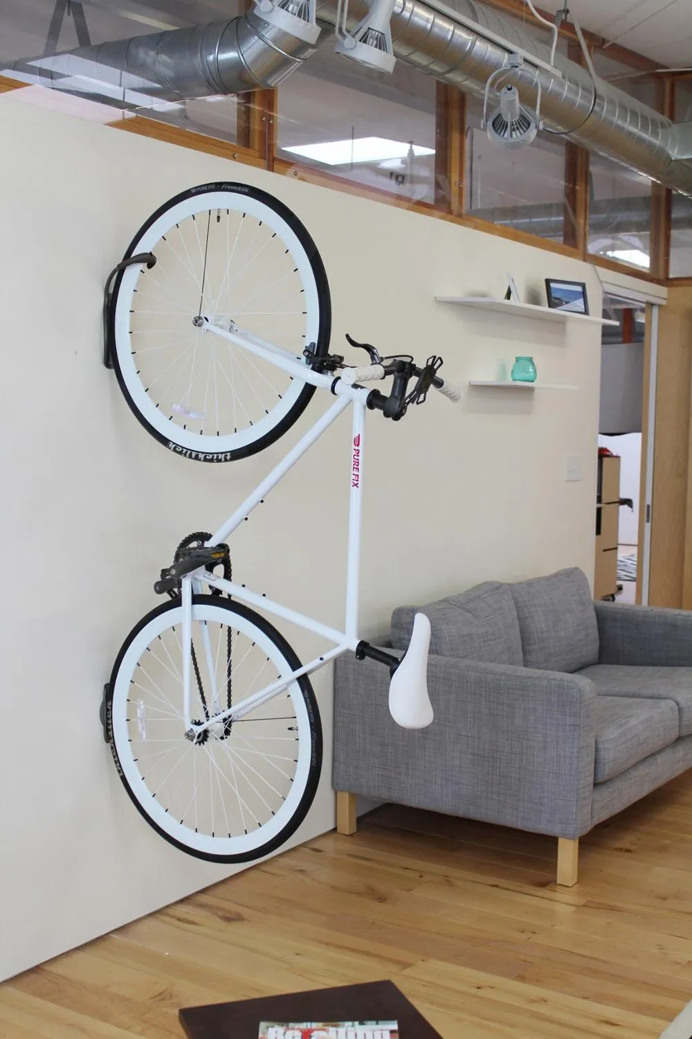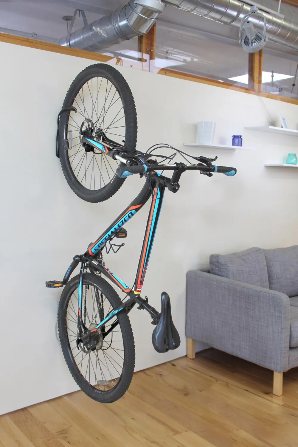 Максимальная нагрузка составляет 40 фунтов (18 кг). Удобное настенное хранение для одного велосипеда со стандартными шинами.