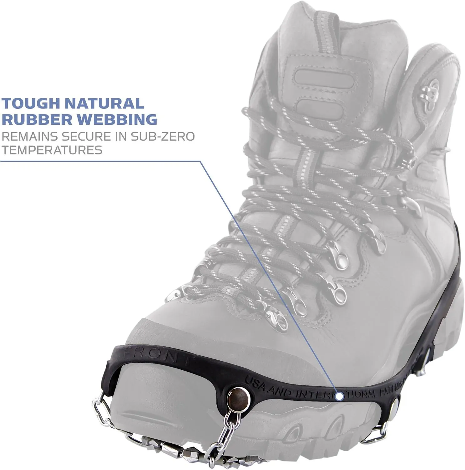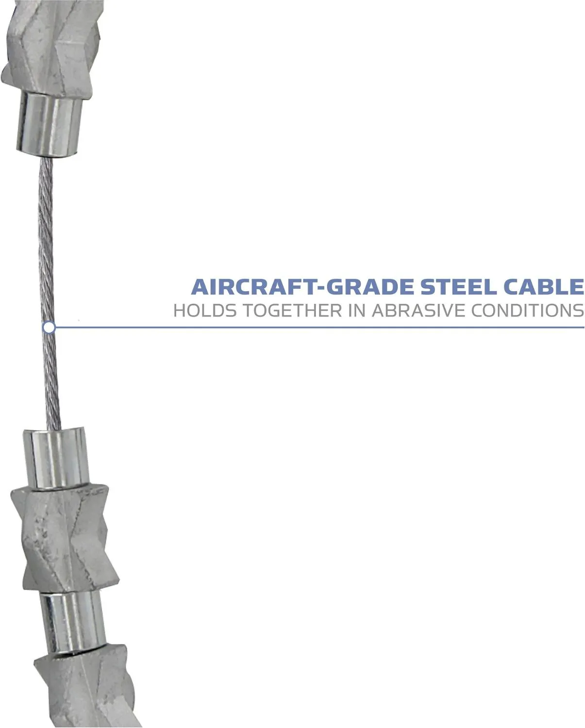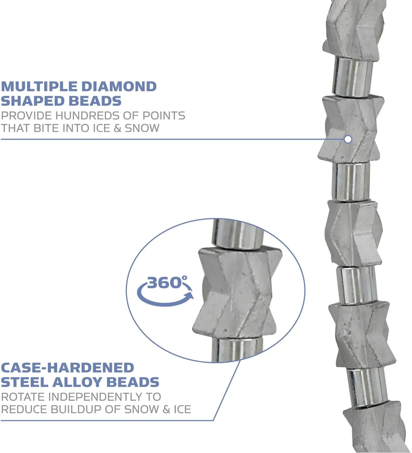 Сталь с закалкой и сплав "шариков" на стальном авиационном кабеле предлагает сотни жующих граней для исключительного сцепления во всех направлениях под ногами.