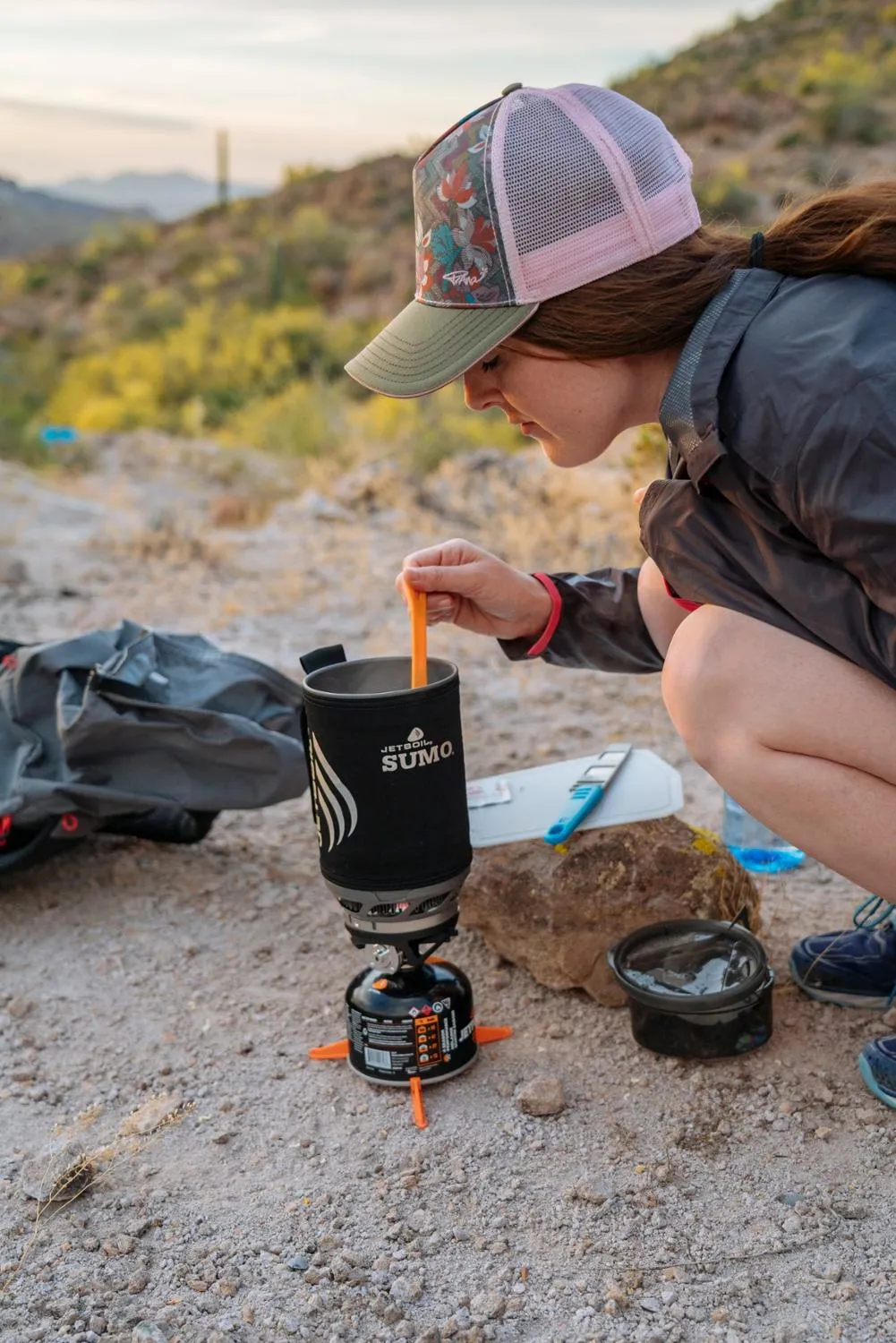 Включает 1,8-литровую алюминиевую кулинарную чашу FluxRing, достаточную для растопки снега или приготовления еды для небольшой группы. Весит 1 фунт, и кулинарная система легко переносится в походах. Горелка имеет регулятор топлива, который поддерживает стабильный поток газа до 20°F, что делает систему подходящей для использования в любое время года. Как и в оригинальном Jetboil, горелка и кулинарная чаша скручиваются вместе, создавая одну удобную кулинарную систему; отсоедините горелку и кулинарную чашу для хранения. Горелка с регулируемым пламенем находится в защитном экране, уменьшая теплопотери при порывистом ветре. Пьезоэлектрический воспламенитель с кнопкой быстро и легко разжигает плиту. Крышка с отверстием для питья имеет носик и отверстия для слива. Чаша Sumo достаточно велика, чтобы вмещать основание горелки Sol и баллон с топливом Jetpower на 100 г или 230 г (не входит в комплект) с запасом места. Нижняя крышка отстегивается от кулинарной чаши и может использоваться как мерный стакан или миска; мерный стакан оказывается полезным, когда. Приготовление еды и горячих напитков