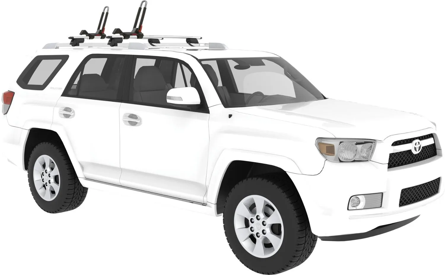 С несколькими настройками, крепление для каяка Yakima JayLow позволяет перевозить 1 лодку в положении J-образного держателя или 2 лодки в вертикальном положении, и оно складывается в плоское состояние, когда не используется.