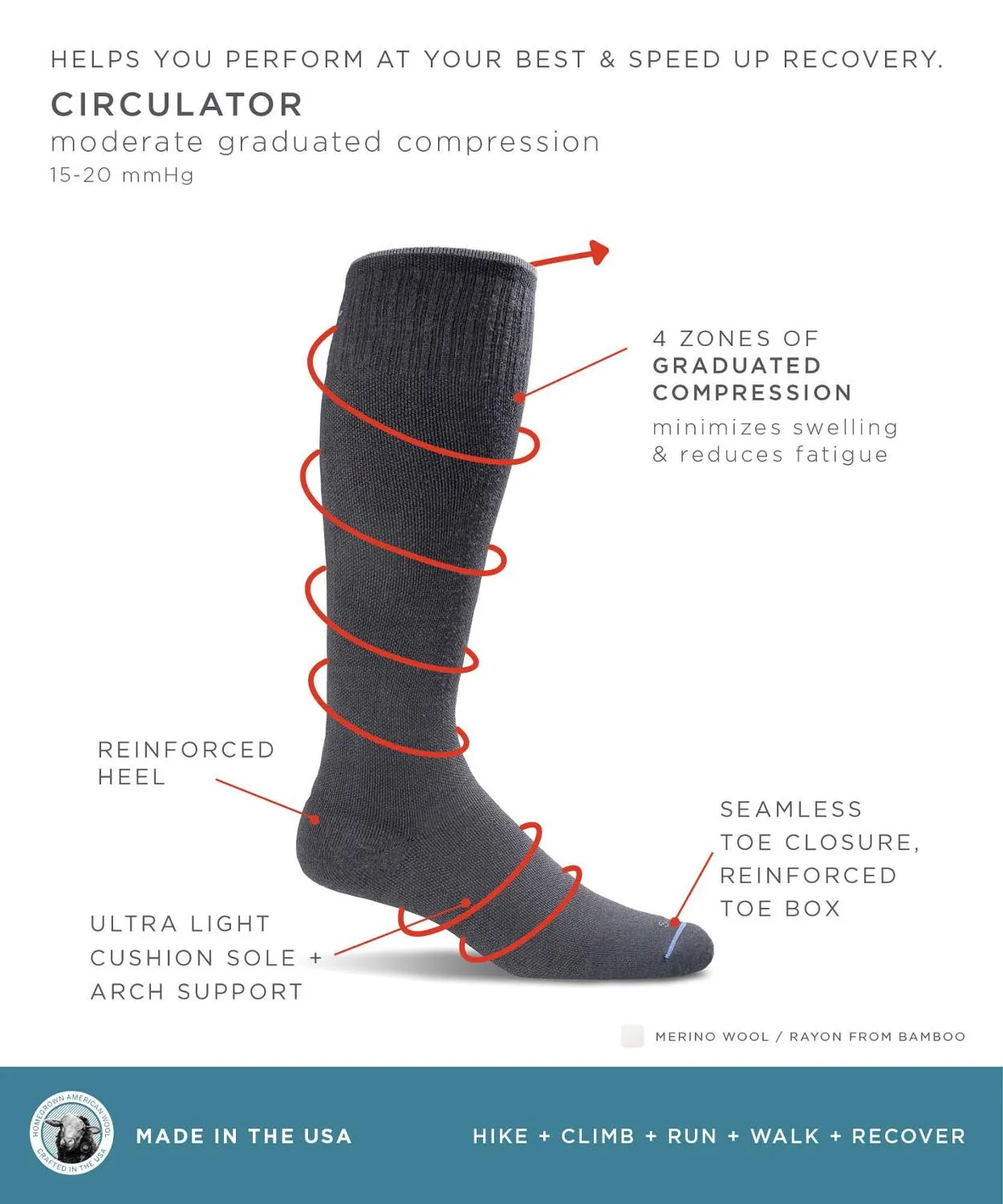 Идеально подходит для дальних поездок, компрессионные носки помогают увеличить приток крови и уменьшить отеки при сидении в течение длительного времени. Градиентное сжатие наибольшее на лодыжках и постепенно уменьшается к верхней части носков; кровь поднимается вверх к вашему сердцу, максимизируя циркуляцию. Умеренное (15 - 20 мм рт. ст.) сжатие рекомендуется для ежедневной носки, длительного сидения или стояния, путешествий, упражнений и восстановления, а также для незначительных и умеренных отеков. Шерсть, нейлон, бамбук и спандекс смешиваются для создания ткани, которая плотно облегает, отводит влагу, быстро сохнет и естественно противостоит запаху. Бесшовные закрытия носка минимизируют натирание; контурные пятки обеспечивают плотную посадку. Вязаные спандекс полосы в арках обеспечивают поддержку и уменьшают скольжение носка на ноге.