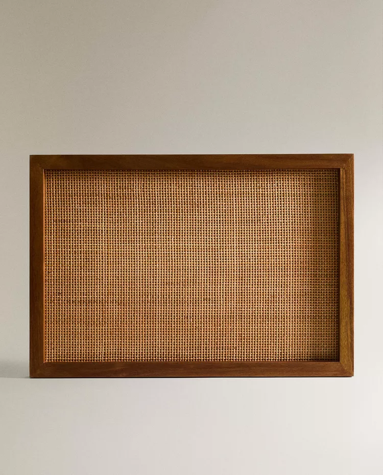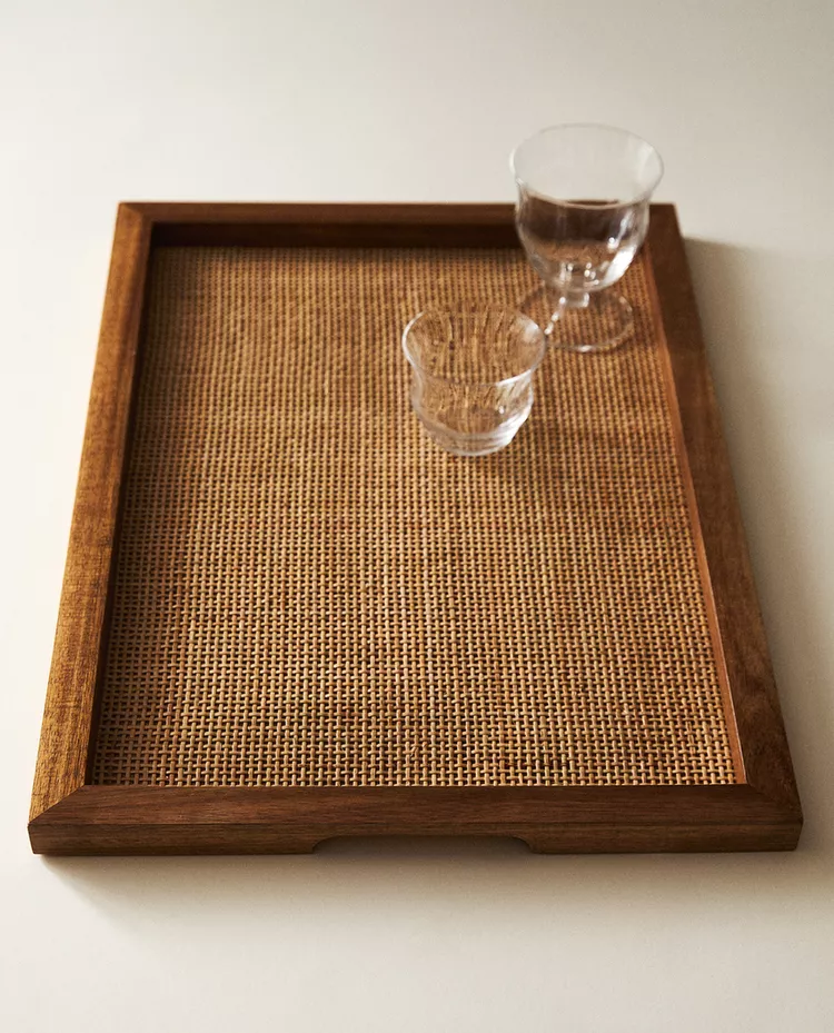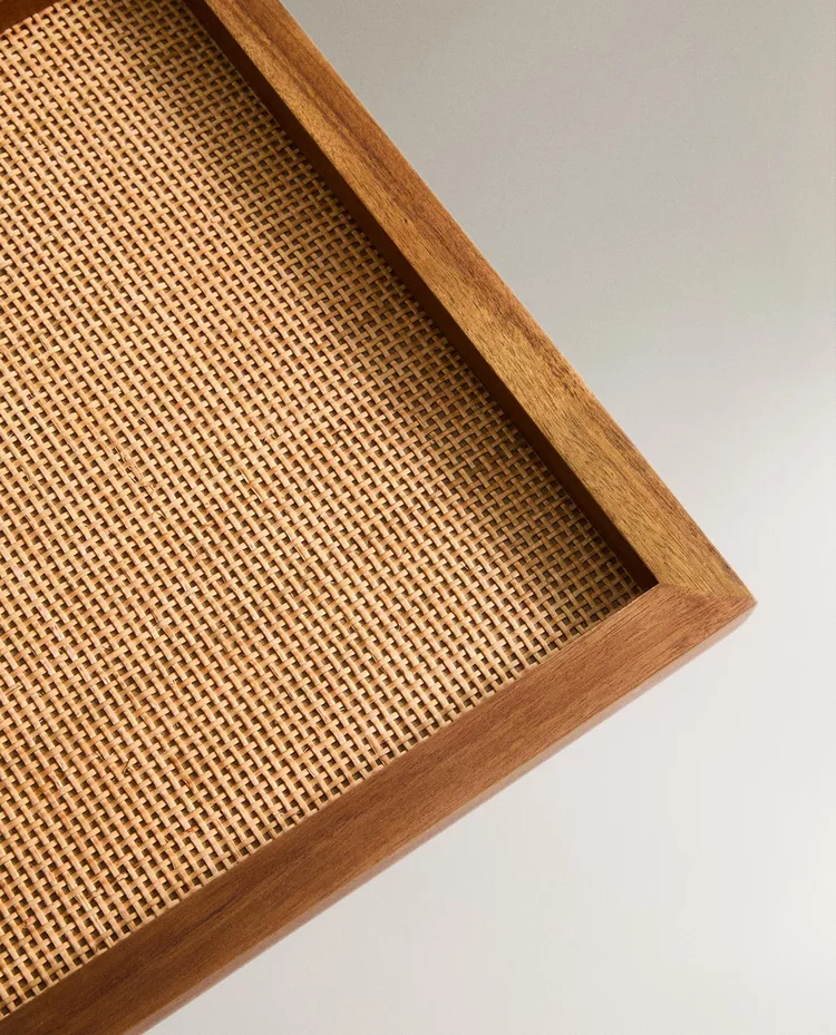 Прямоугольный деревянный поднос на ротанговом основании. С двумя ручками на каждом конце.
