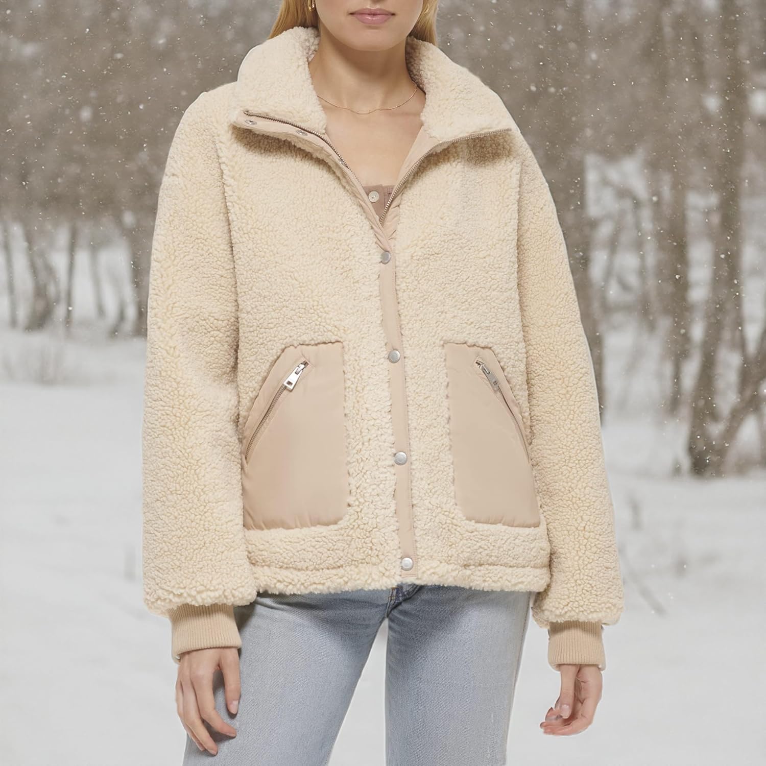 Очень уютная куртка из шерпы с воротником-стойкой и детальной застежкой-молнией, застежкой-молнией по центру спереди с накладкой на кнопках, двумя нижними карманами на молнии с нейлоновой отделкой и манжетами в рубчик.