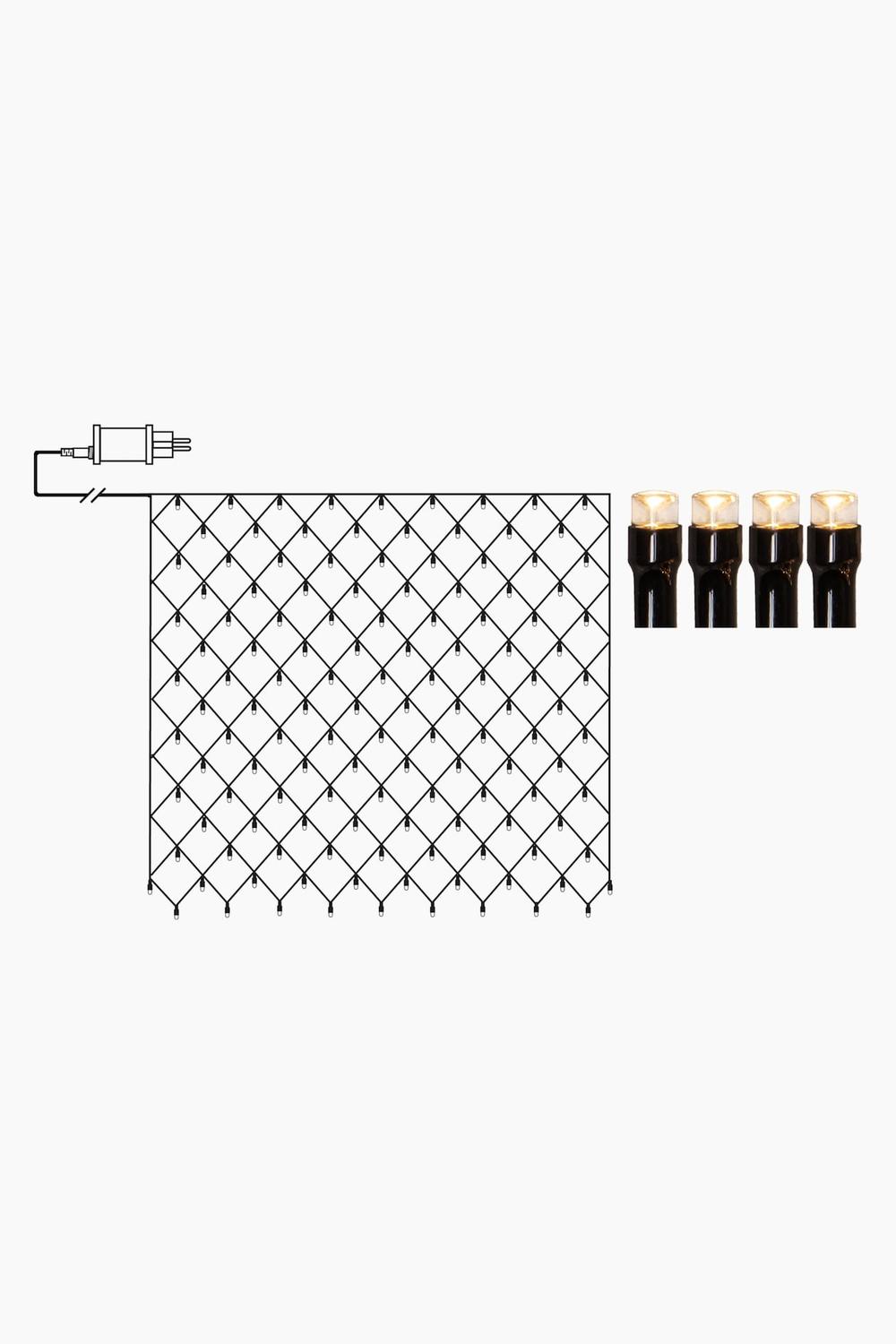 Эта сетка оснащена 200 светодиодными точками с красивым тёплым белым светом. Размеры сетки: 3x3 м. Идеально подходит для украшения вашего сада. Длина соединительного кабеля — 5 м.