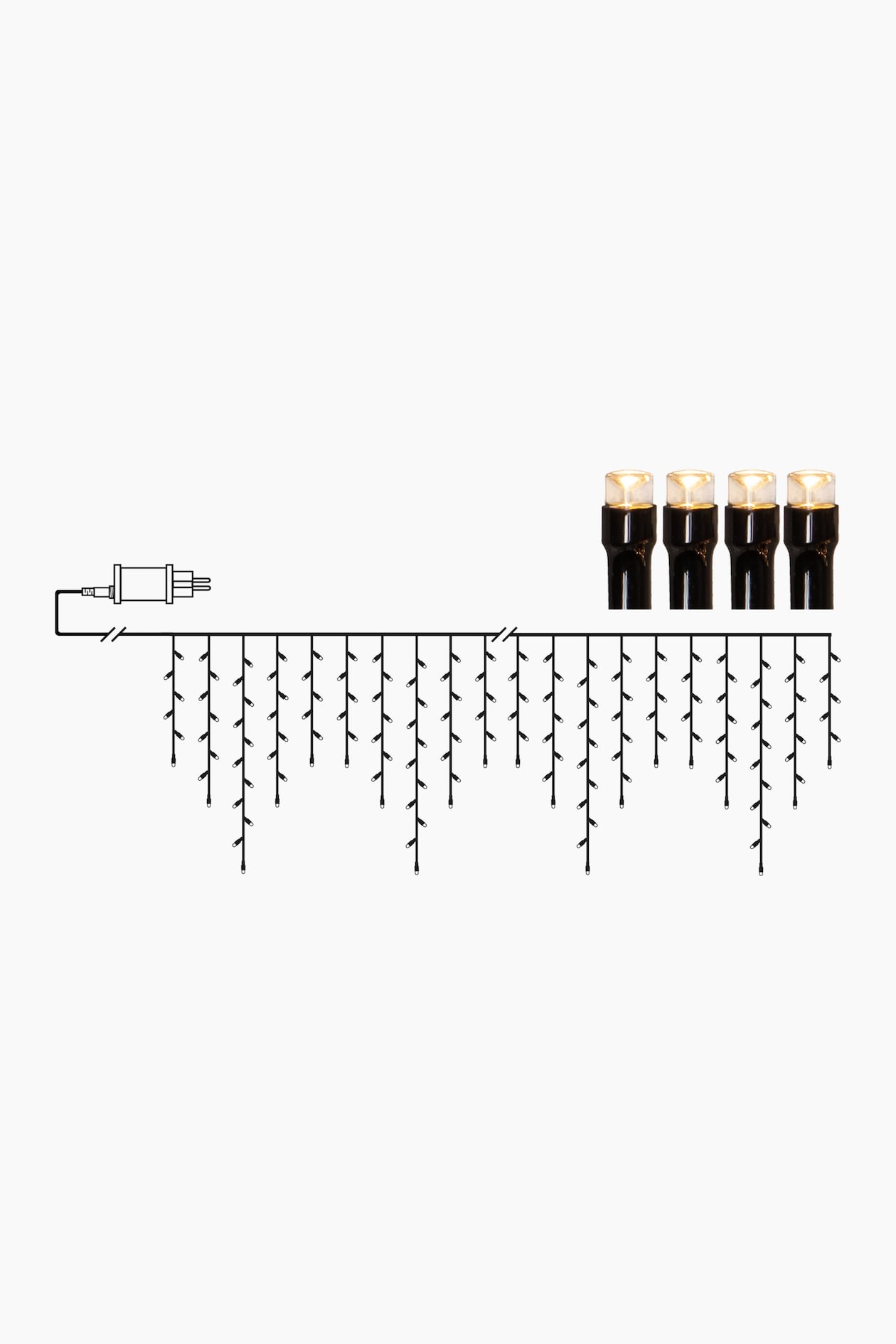 Длина гирлянды составляет около 24 метров, и она поставляется с тремя вариантами длины сосулек: 15, 35 и 55 см