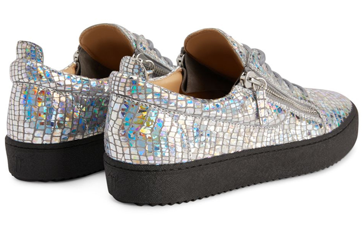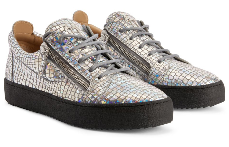 Низкие кроссовки выполнены из замши с серым ламинированным переливающимся крокодиловым принтом, оснащены черными хлопковыми шнурками, серебристой металлической деталью «Signature» на языке и серебристой боковой молнией на верхней части; дизайн завершает черная резиновая подошва.
