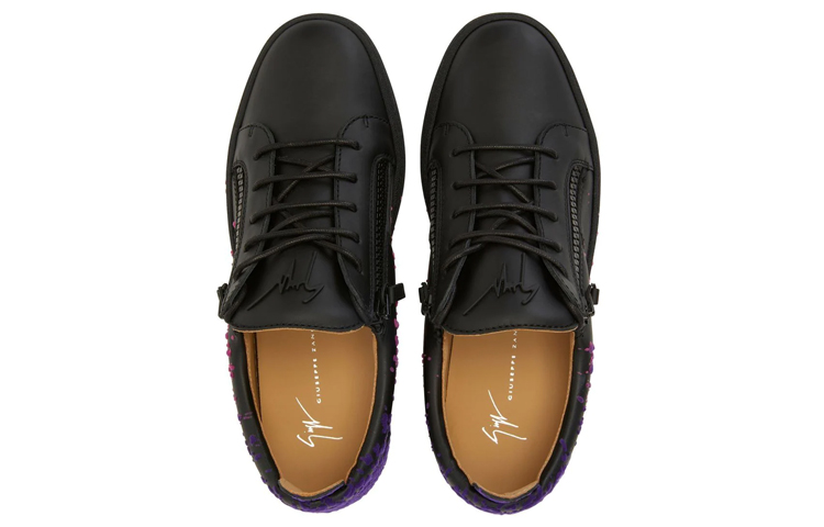 Эта черная кожаная низкая кроссовка отличается минималистичным верхом, который контрастирует с фиолетовым и розовым напылением на заднике, создавая смелый, привлекающий внимание уличный художественный стиль. Черные металлические детали «Signature» с резиновым покрытием, соответствующая боковая молния и черная резиновая подошва добавляют завершающие штрихи дизайну.