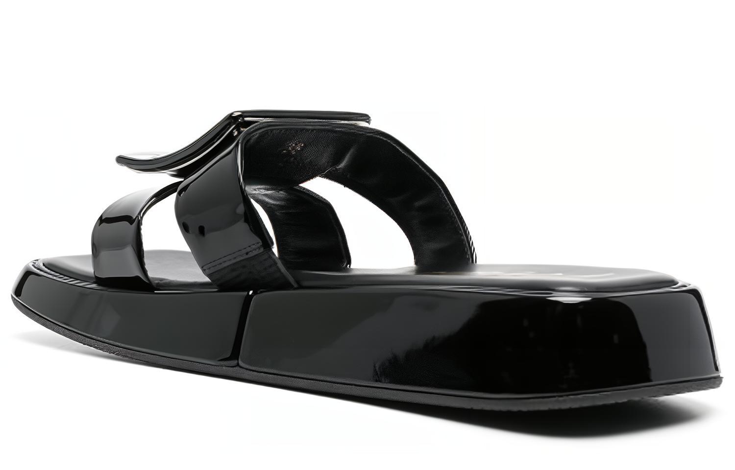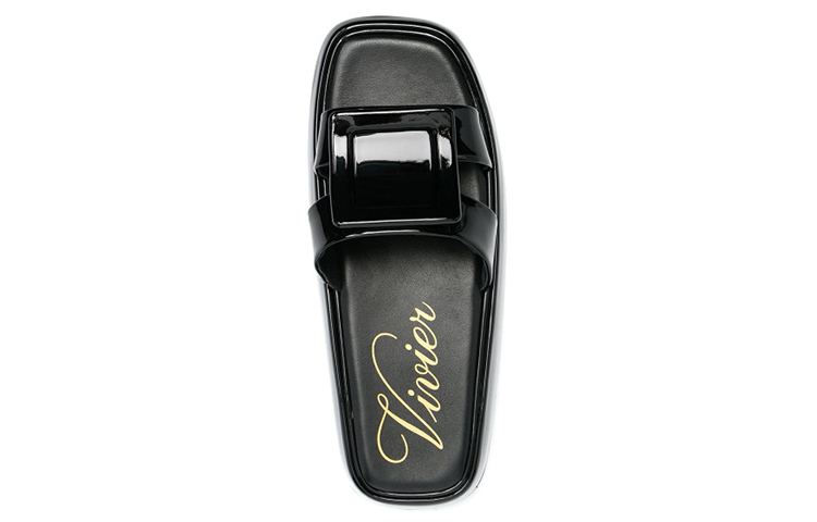 ROGER VIVIER черные кожаные лакированные босоножки, декоративная пряжка, фирменная кожаная стелька, амортизирующая стелька, открытый носок и квадратный мыс.