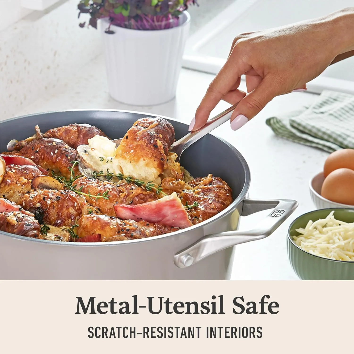 Каждое блюдо станет шедевром с голландской печью Calphalon Premier Ceramic Nonstick. Тщательно разработанная с прочной конструкцией и стильным дизайном, эта голландская печь является выдающимся дополнением к любой коллекции посуды. Используйте сковороды, которые выглядят как новые после каждого использования благодаря нашей технологии быстрой очистки, что делает уборку без усилий. Скажите прощай утомительной чистке и здравствуй долговечности. Анодированная керамическая алюминиевая конструкция обеспечивает быстрый и равномерный нагрев, устраняя горячие точки для точного обжаривания, жарки и золотистости - гарантируя исключительные результаты каждый раз. Конструкция с антипригарным керамическим покрытием, свободным от ПФА, стойким к царапинам и безопасным для металлических кухонных принадлежностей делает приготовление пищи удовольствием. А с технологией быстрой очистки уборка становится легкой. Длинные ручки из нержавеющей стали остаютсяcool на плите, в то время как кастрюли и закаленные стеклянные крышки безопасны для использования в духовке до 500 градусов по Фаренгейту, обеспечивая универсальность от плиты до духовки. Голландская печь Calphalon Premier Ceramic Nonstick - это необходимый инструмент. Для любого кулинарного энтузиаста, предлагающего гурманский опыт от томления мяса и готовки вкусных рагу до выпечки хлеба и всего, что между ними.