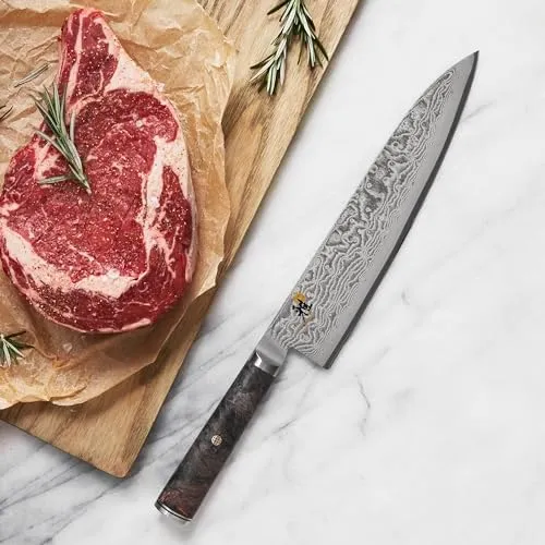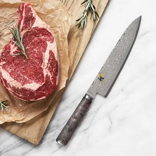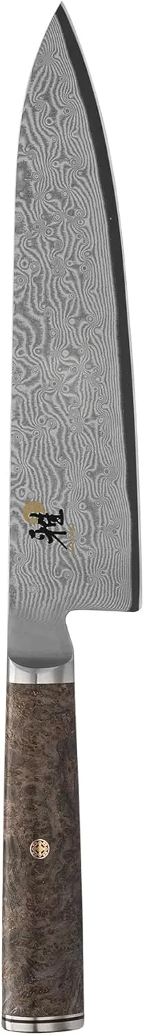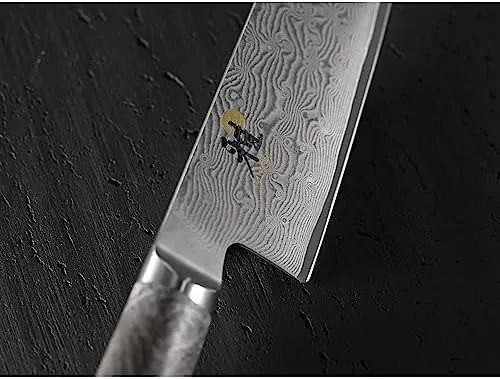 Miyabi Black 5000MCD - это настоящее произведение искусства. Лезвие изготовлено из стружки микрокарбидной стали MC66, закаленной в льду до впечатляющих 66 HRC. Это приводит к исключительно острому и долговечному лезвию. Лезвие обрамлено 132 дополнительными слоями стали, образующими красивый дамасский узор цветка. Рукоятка серии Miyabi Black изготовлена из уникального дерева - черного ясеня. Текстура и цвет черного ясеня контрастируют с дамаском лезвия. Рукоятка выполнена в традиционной форме «D», что обеспечивает оптимальную эргономику для безутомительного нарезания в кухне. Ручная работа в Сэки, япония.